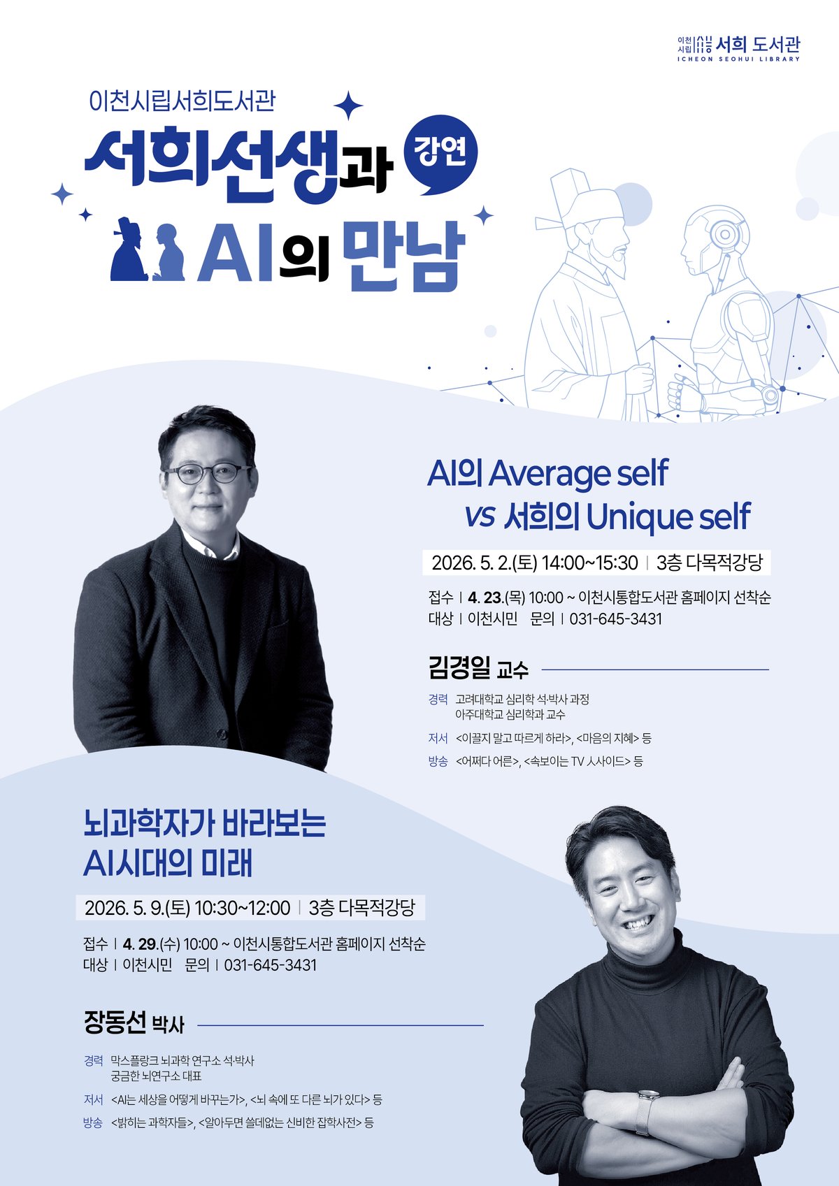 강연 참여 신청은 4월 23일 오전 10시부터 이천시통합도서관 누리집에서 선착순 100명에 한해 접수한다. 서희도서관 관계자는 “이번 강연은 첨단 기술인 인공지능과 이천의 역사적 인물인 서희 선생을 융합하여 시민들에게 새로운 시각을 제공하고자 기획했다”고 밝혔다.