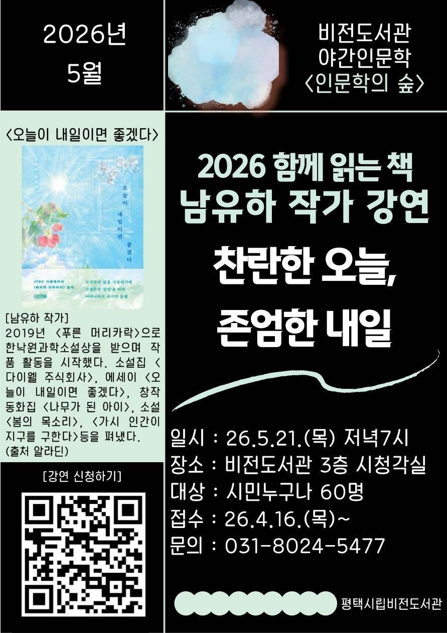 이번 강연은 '찬란한 오늘, 존엄한 내일'이라는 주제로 진행된다. 특히, 2026년 평택시 함께 읽는 책으로 선정된 남유하 작가의 에세이 '오늘이 내일이면 좋겠다'를 중심으로 이야기가 펼쳐질 예정이다.