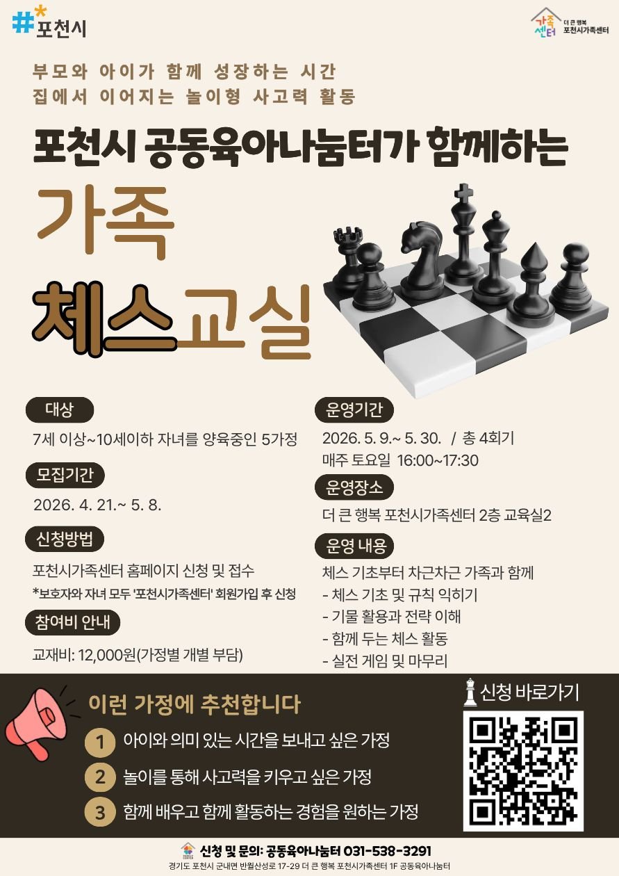 가족 체스 교실 프로그램 참여 신청 및 자세한 일정은 포천시가족센터 홈페이지에서 확인할 수 있다. 관련 문의는 포천시가족센터 공동육아나눔터 담당자에게 문의하면 된다.
