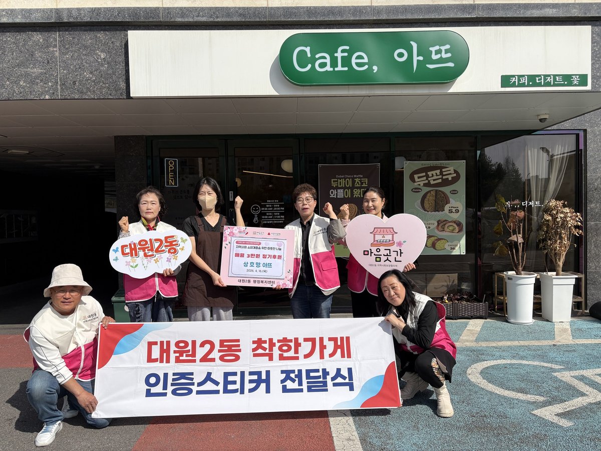 [PEDIEN] 오산시 대원2동에 위치한 카페 ‘아뜨’가 착한날개 14호점으로 지정됐다. 지난 16일, 대원2동은 카페 ‘아뜨’에 인증 스티커를 전달하며 나눔 문화 확산에 힘을 보탰다.