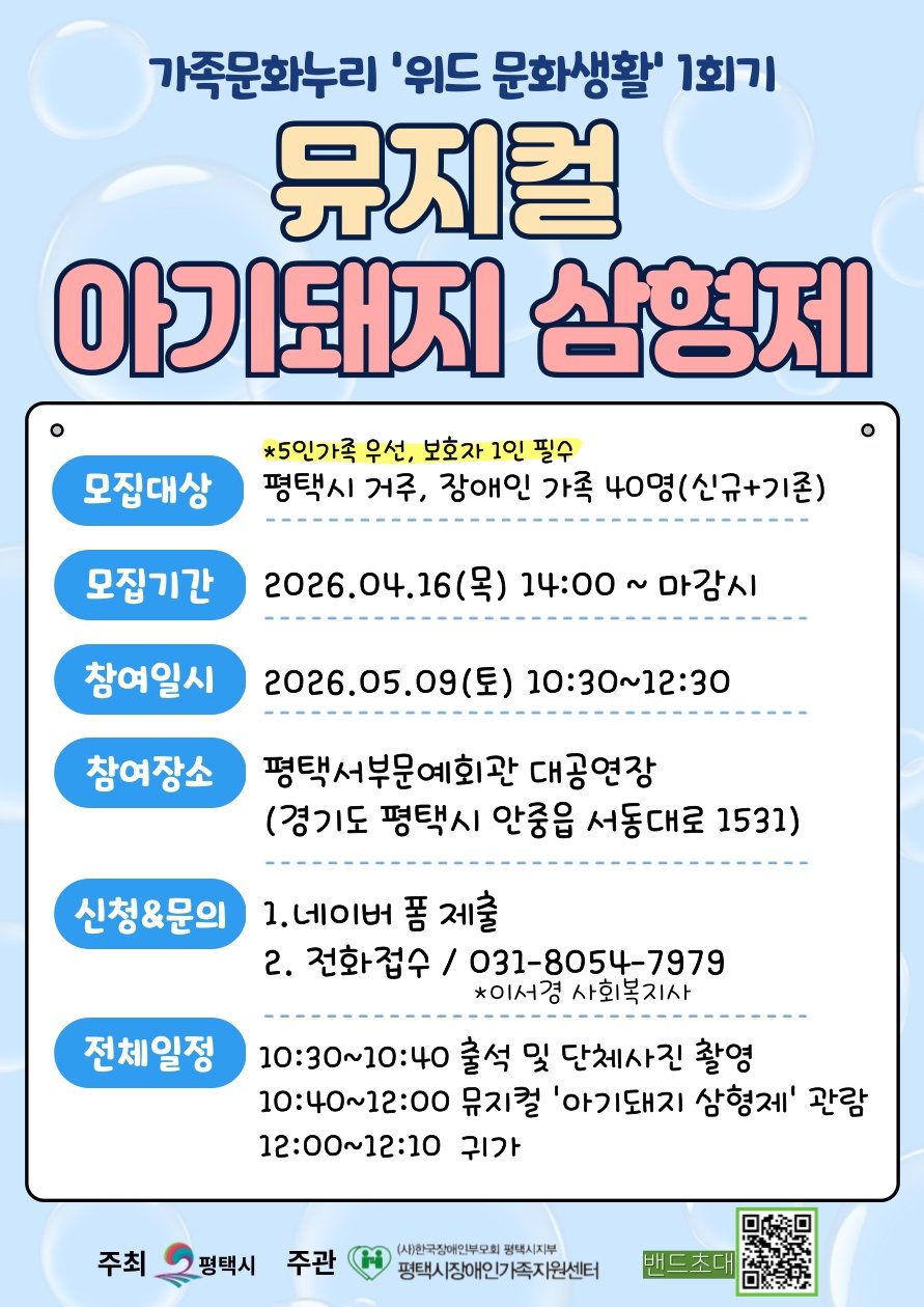 공연 관람을 통해 가족 간 긍정적인 상호작용을 촉진하고 유대감 향상에 기여할 것으로 기대된다. 참여 대상은 평택시에 거주하는 장애인 가족 40명이며, 보호자 동반은 필수다. 다인 가족에게는 우선 선정 기회가 주어진다.