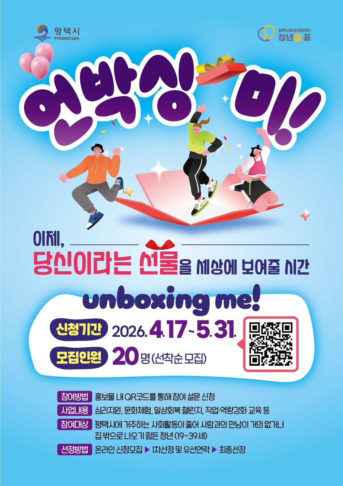 [PEDIEN] 평택시가 사회 활동이 어려운 고립·은둔 청년들을 위해 '언박싱 미' 지원사업을 시작한다. 4월 17일부터 5월 31일까지 평택시에 거주하는 청년들을 대상으로 참여자를 모집한다.