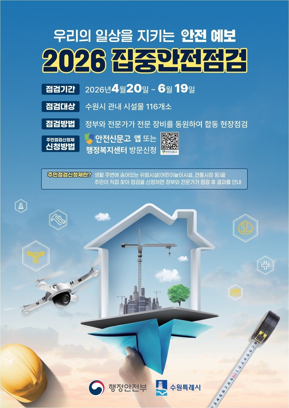 [PEDIEN] 수원시가 20일부터 6월 19일까지 시민 안전을 최우선으로 하는 ‘2026년 집중안전점검’을 실시한다.