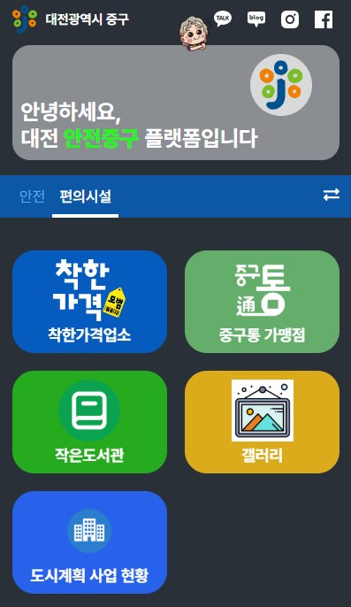 도시공간지도는 '대전 안전중구 플랫폼'을 검색해 접속 후 '편의시설' 메뉴에서 '도시계획 사업 현황'을 선택하면 이용 가능하다. 모바일 기기에도 최적화되어 있어 장소에 구애받지 않고 편리하게 이용할 수 있다.
