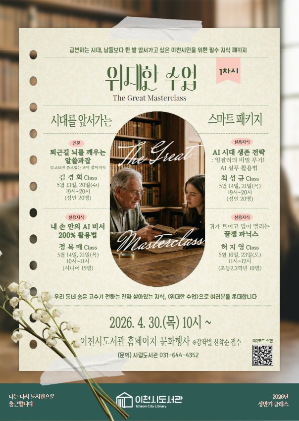 [PEDIEN] 이천시립도서관이 은퇴 세대의 경험과 지식을 지역 사회에 나누는 '위대한 수업' 프로그램을 운영하고, 4월 30일부터 수강생을 모집한다.