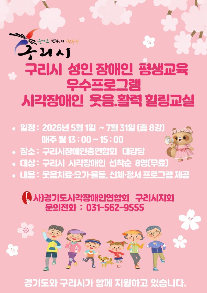 [PEDIEN] 구리시가 시각장애인 어르신들의 활기찬 노년 생활을 위해 특별한 프로그램을 마련했다. 사단법인 경기도시각장애인연합회 구리시지회는 2026년 5월부터 '시각장애인 웃음·활력 힐링 교실'을 운영한다고 밝혔다.