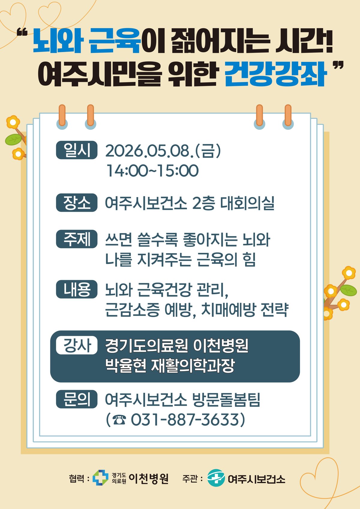 [PEDIEN] 여주시가 시민들의 건강한 노후를 위해 특별한 강좌를 마련했다. 5월 8일 오후 2시, 여주시보건소 2층 대회의실에서 ‘뇌와 근육이 젊어지는 시간’이라는 주제로 건강 강좌를 개최하는 것이다.