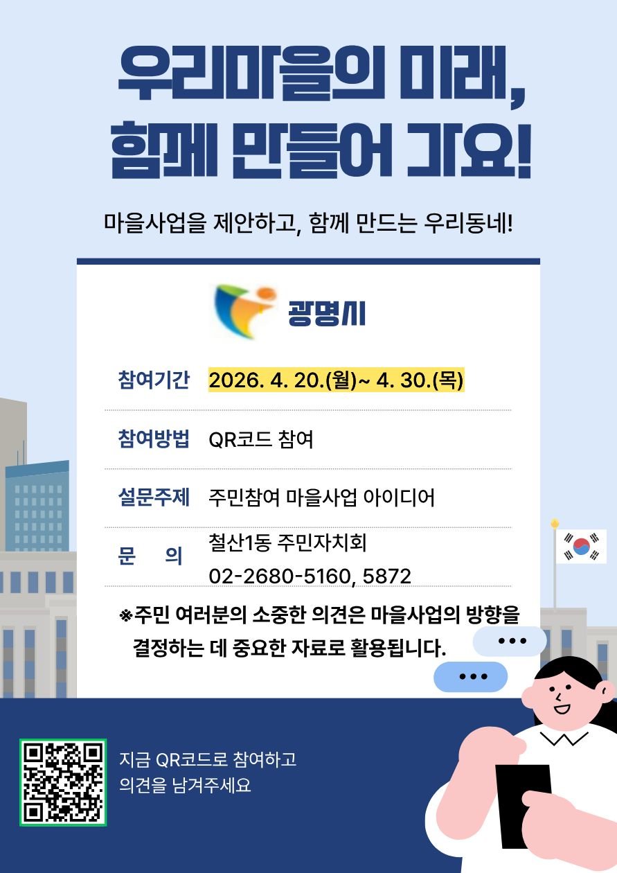 양애순 철산1동장은 “주민들의 소중한 의견이 마을 발전의 밑거름이 될 수 있도록 적극 지원하겠다”며 “앞으로도 주민자치 활성화를 위한 행정적 지원을 아끼지 않겠다”고 밝혔다.