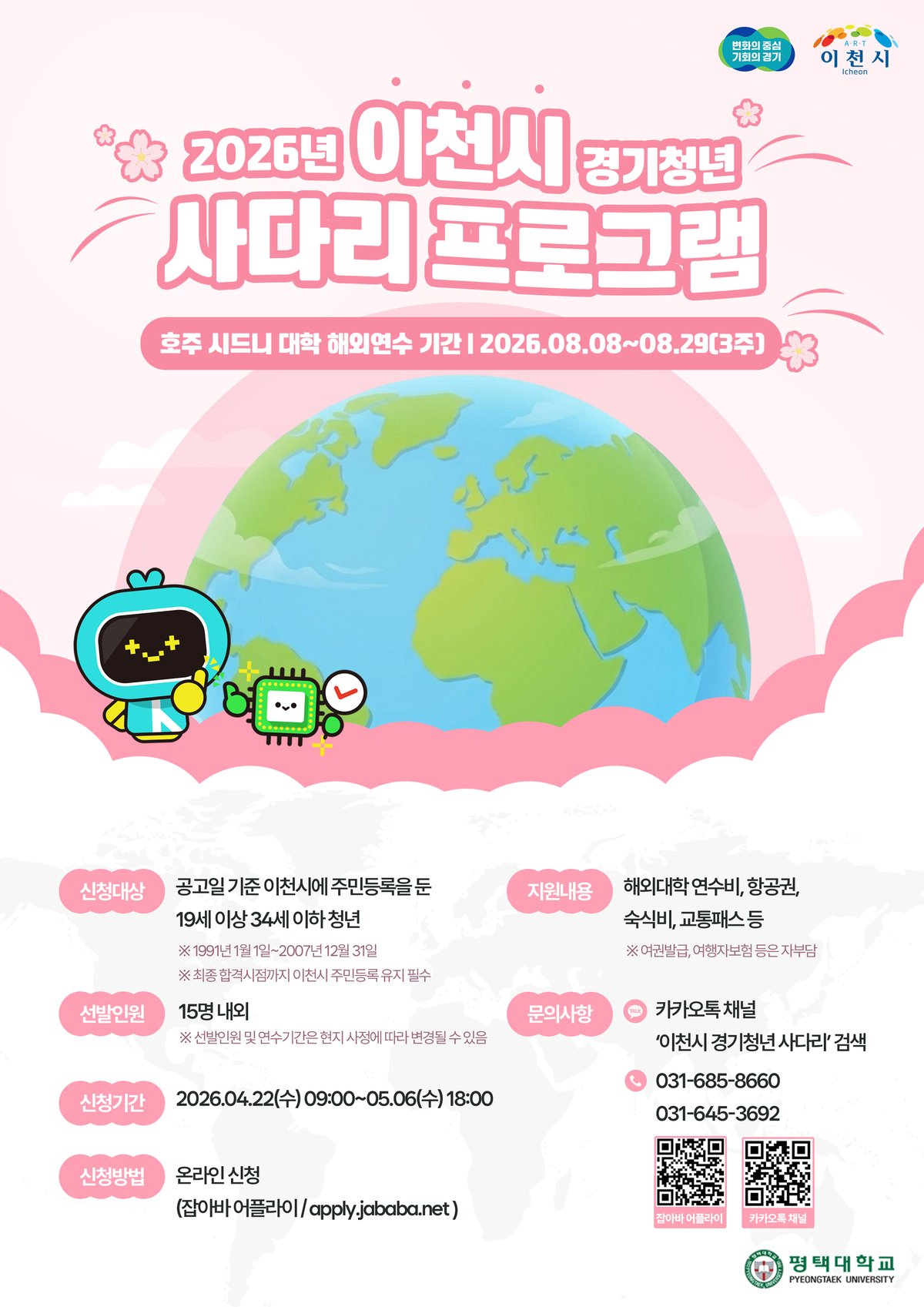 모집 대상은 공고일 기준 이천시에 주민등록이 되어 있는 19세 이상 34세 이하의 청년으로 해외 연수에 결격 사유가 없는 사람이면 지원이 가능하다.