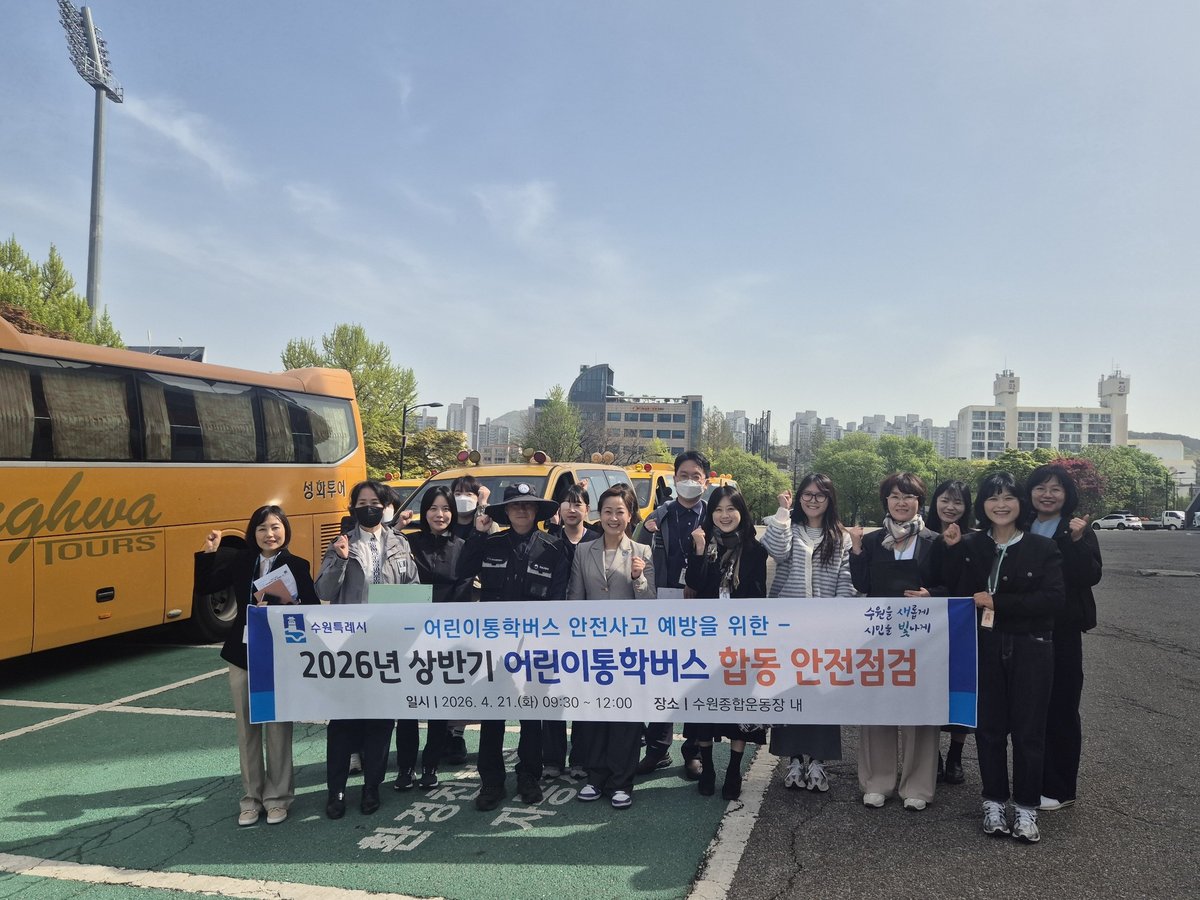 [PEDIEN] 수원시가 2026년 상반기 어린이통학버스 합동 안전점검을 21일 수원종합운동장 주차구역에서 진행했다.
