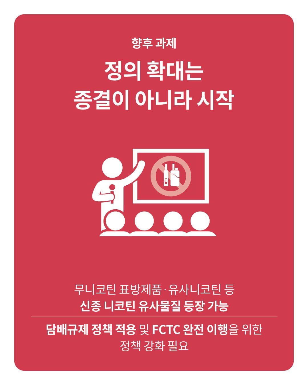 앞으로는 연초나 니코틴을 원료의 전부 또는 일부로 해 제조된 제품까지 담배에 포함되며 이에 따라 그동안 규제 사각지대에 있었던 합성니코틴 액상형 전자담배 등 모든 담배가 규제 대상에 포함된다.