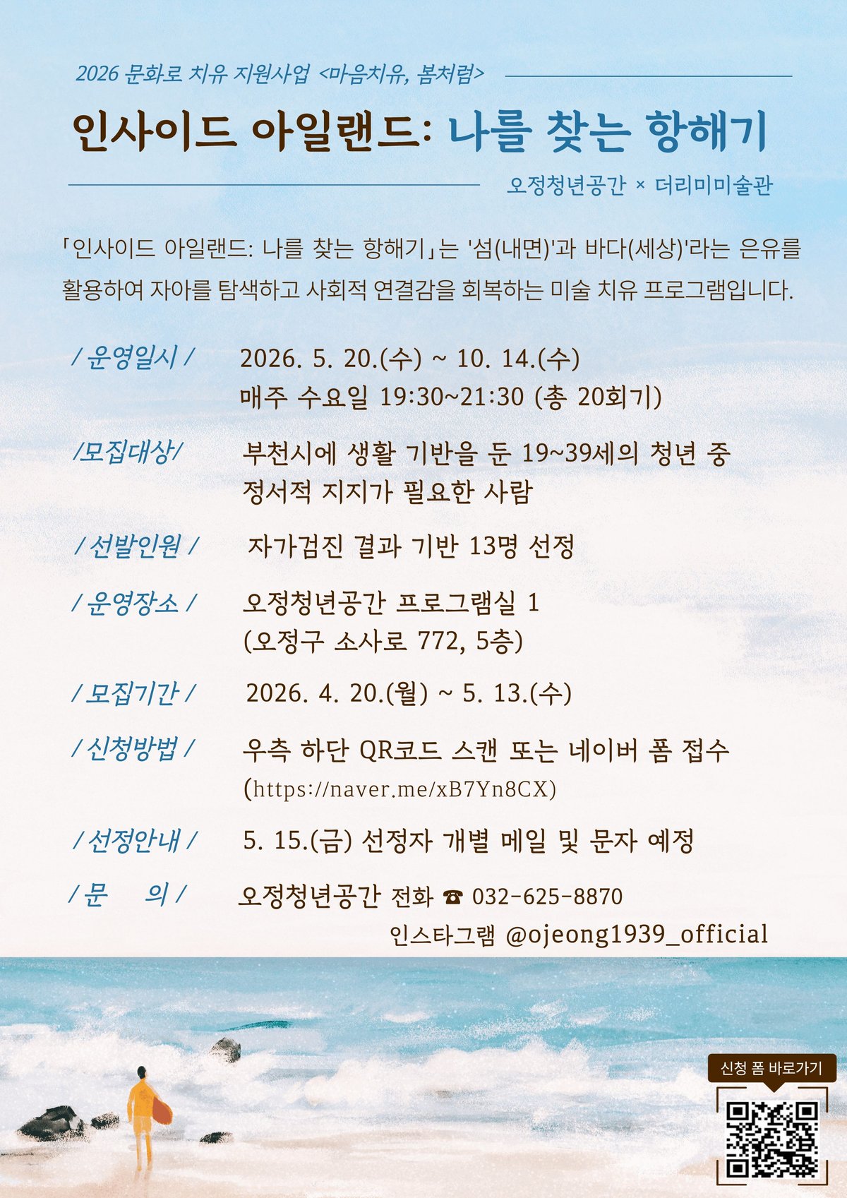 부천시에 거주하거나 활동하는 청년이라면 누구나 참여할 수 있다. 프로그램은 5월 20일부터 10월 14일까지 매주 수요일에 진행된다. 신청은 포스터의 QR코드를 통해 가능하다.