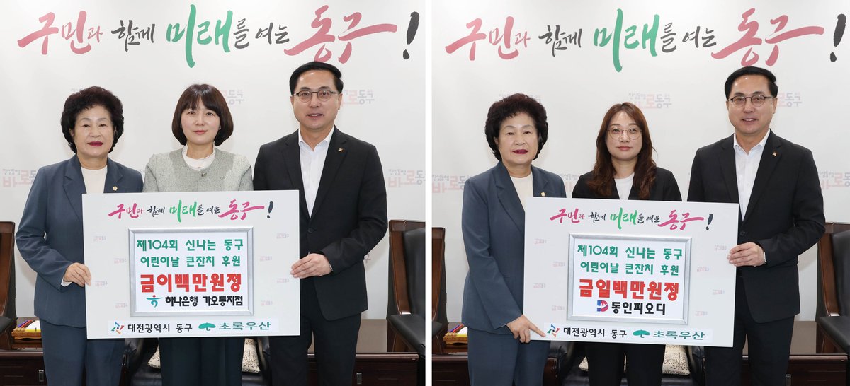 하나은행 가오동지점과 동인피오디가 '제104회 신나는 동구 어린이날 큰잔치'를 위해 각각 후원금을 기탁하며 나눔에 동참했다.