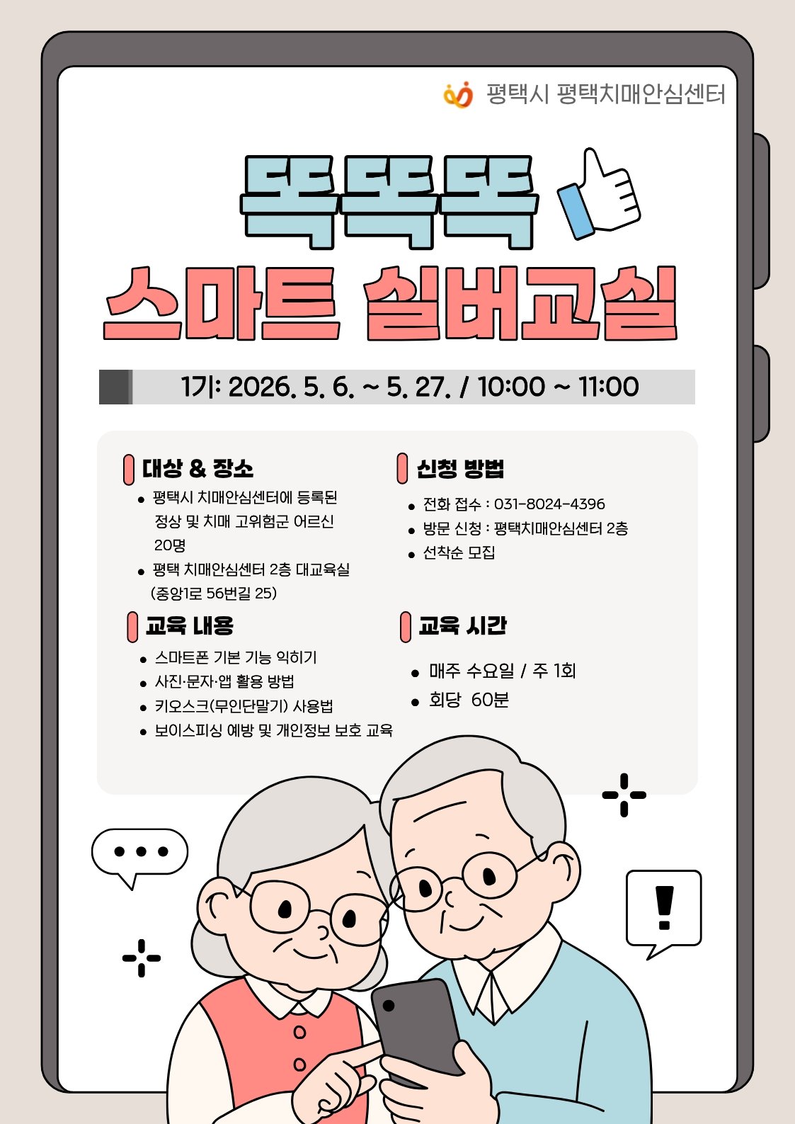 평택치매안심센터는 5월 6일부터 27일까지 등록된 어르신 중 정상군 및 치매 고위험군을 대상으로 프로그램을 진행한다고 밝혔다. 이번 교육은 치매 예방뿐만 아니라 어르신들이 실생활에서 디지털 기기를 능숙하게 사용할 수 있도록 돕는 데 초점을 맞췄다.