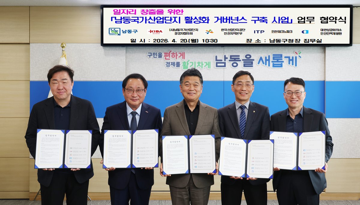 협약에는 남동구를 비롯해 (사)남동국가산업단지 경영자협의회, 한국산업단지공단 인천지역본부, 인천테크노파크, 대한상공회의소 인천인력개발원 등 총 5개 기관이 참여했다.