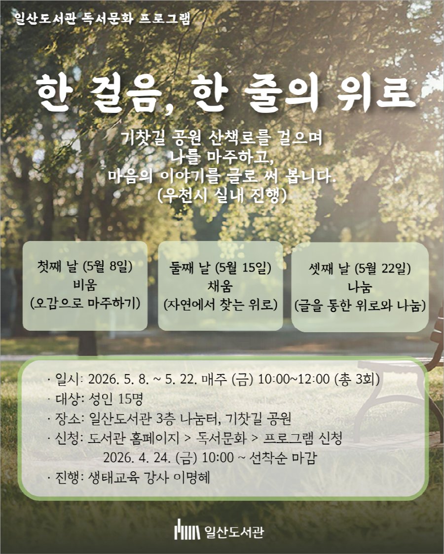 [PEDIEN] 고양시 일산도서관이 오는 5월, 특별한 독서문화 프로그램을 운영한다. 기찻길 공원을 산책하며 자신의 감정을 글로 표현하는 ‘한 걸음, 한 줄의 위로’다.
