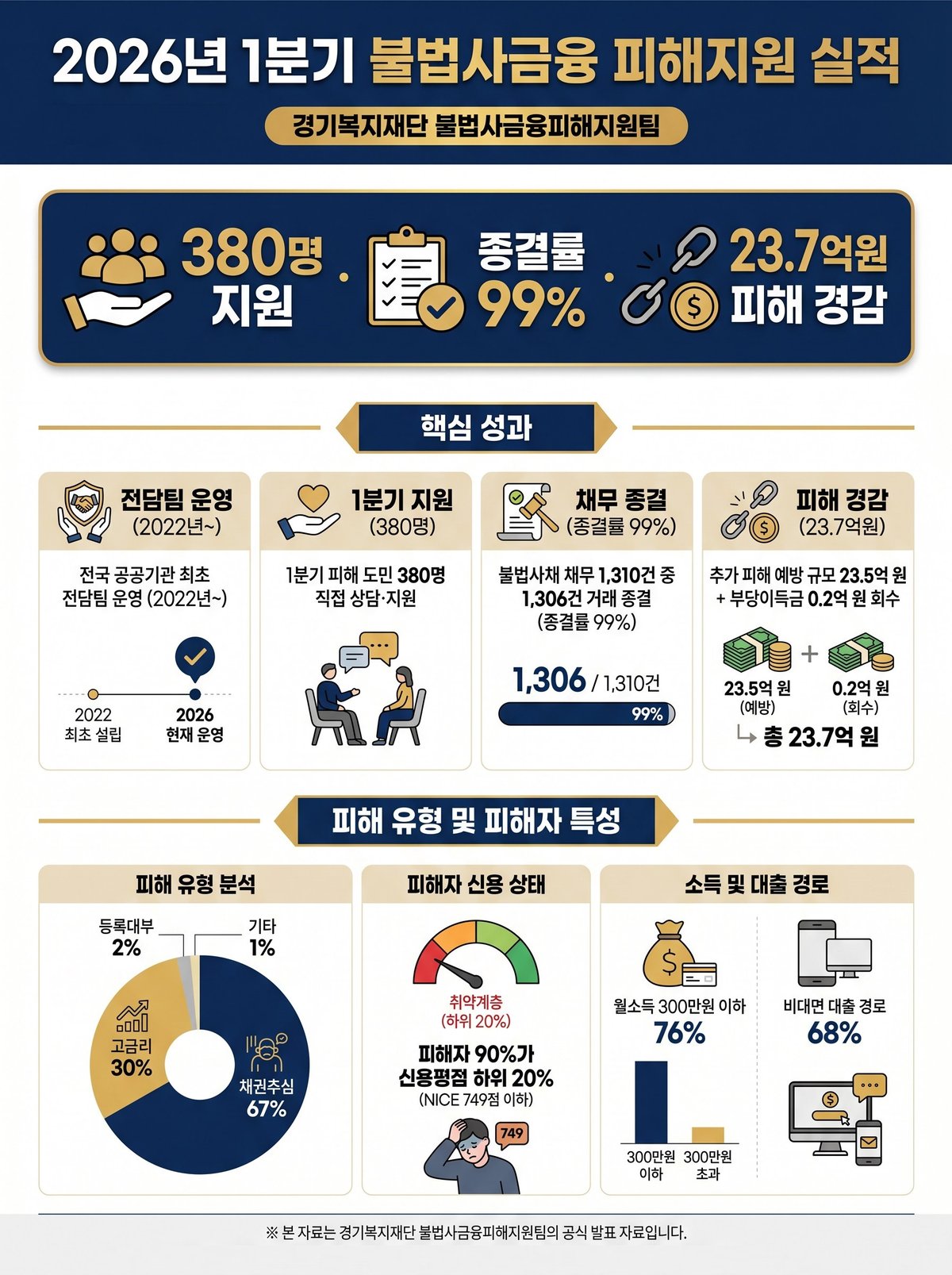 경기복지재단은 지난 3월 금융위원회 등과 불법사금융 원스톱 지원 협약을 맺었다. 경기도의 피해자 직접 대응 방식이 정책 설계에 반영됐으며, 3년간의 지원 실적이 원스톱 지원체계의 핵심 모델이 됐다.