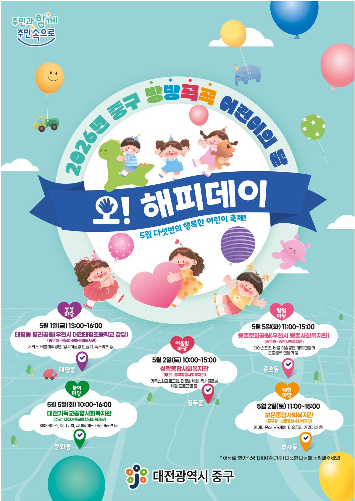 [PEDIEN] 대전 중구가 어린이의 달을 맞아 오는 5월 1일부터 5일까지 관내 5개 마을에서 분산형 '오 해피데이' 어린이 축제를 개최한다. 구는 특정 장소에 대규모 인파가 집중되던 기존 방식에서 벗어나, 안전하고 편안하게 즐길 수 있는 테마형 맞춤 축제를 선보인다.