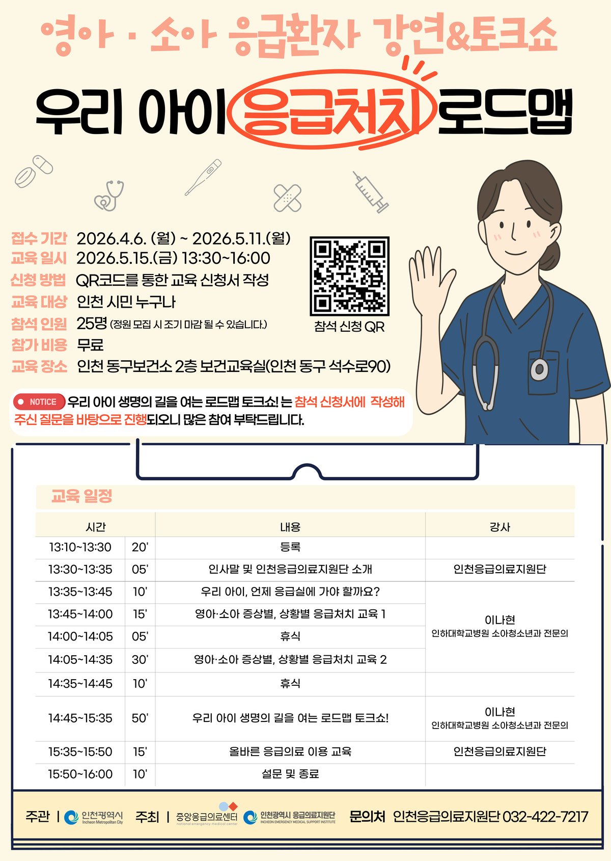 시는 이 같은 보호자들의 불안감을 해소하고 실질적인 응급처치 요령을 전수하기 위해 이번 프로그램을 마련했다. 이번 강연은 인천시가 주최하고 인천응급의료지원단이 주관한다.