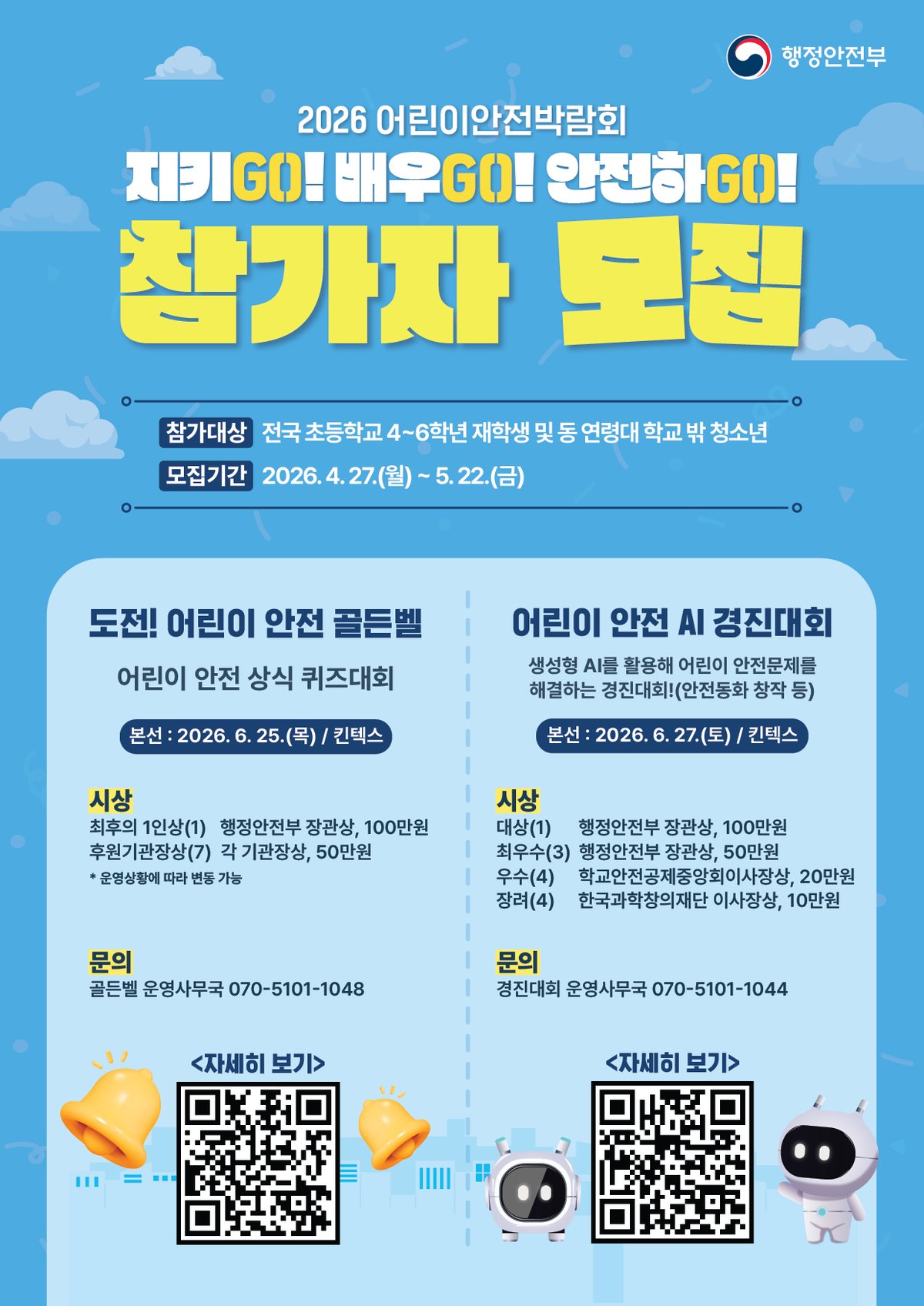 [PEDIEN] 행정안전부가 오는 6월 25일부터 27일까지 경기도 고양시 킨텍스에서 ‘2026 어린이안전박람회’를 연다. 이번 박람회는 어린이들이 스스로 올바른 안전 의식과 습관을 기를 수 있도록 다양한 체험 활동을 제공하며, 특히 ‘도전 어린이 안전 골든벨’과 ‘어린이 안전 AI 경진대회’ 참가자를 사전 모집한다.