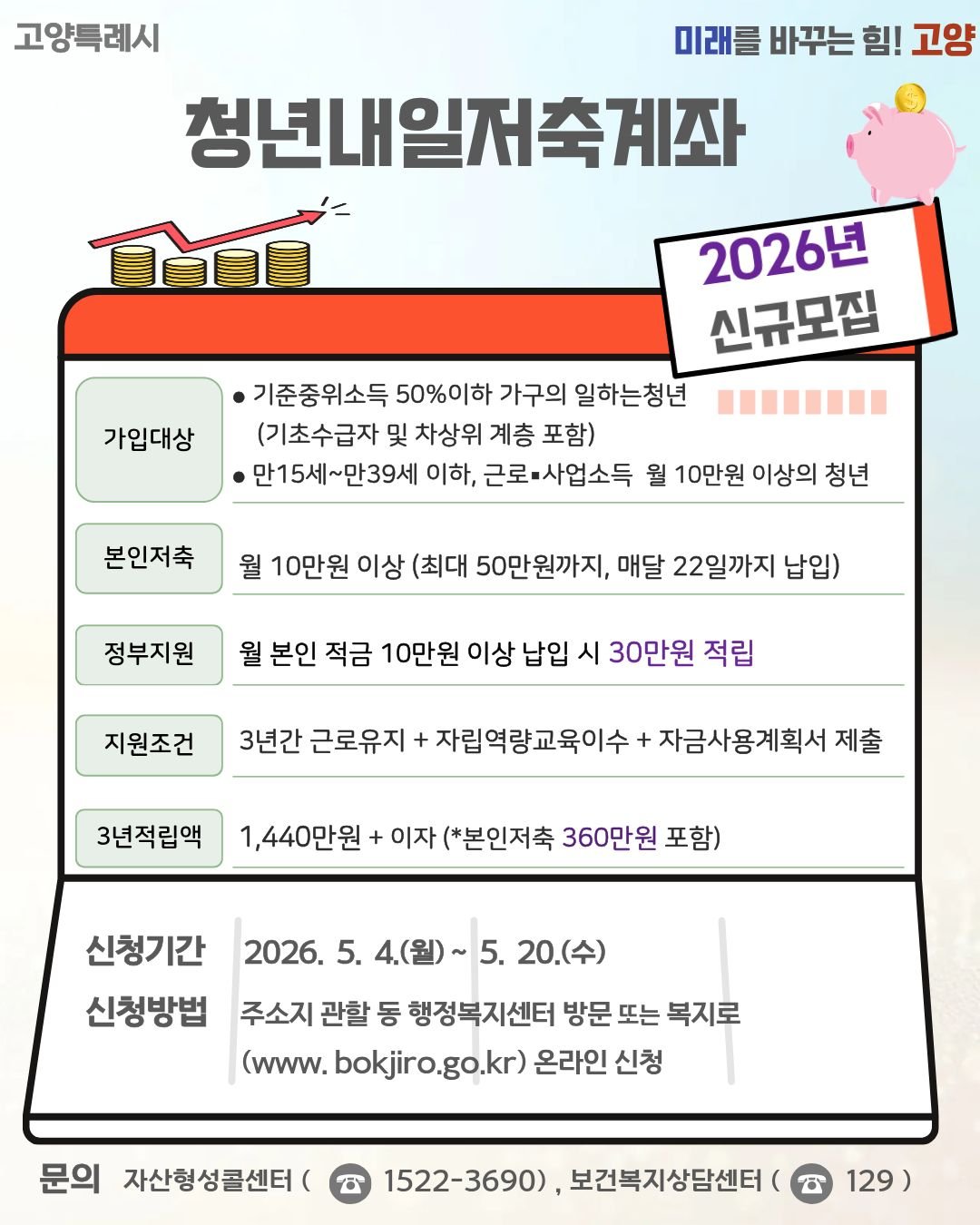 [PEDIEN] 고양특례시가 일하는 청년들의 안정적인 자립을 돕기 위해 '청년내일저축계좌' 신규 가입자 모집에 나섰다. 이 사업은 청년이 매월 일정 금액을 저축하면 정부가 근로소득장려금을 매칭 지원해 최대 1440만원의 목돈 마련을 돕는 핵심 자산 형성 프로그램이다.