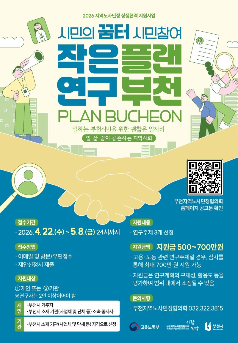 자세한 공모 내용은 부천지역노사민정협의회 홈페이지 공지사항이나 홍보 포스터의 QR 코드를 통해 확인할 수 있다. 시민들의 창의적인 아이디어가 부천의 새로운 정책으로 꽃피울지 주목된다.