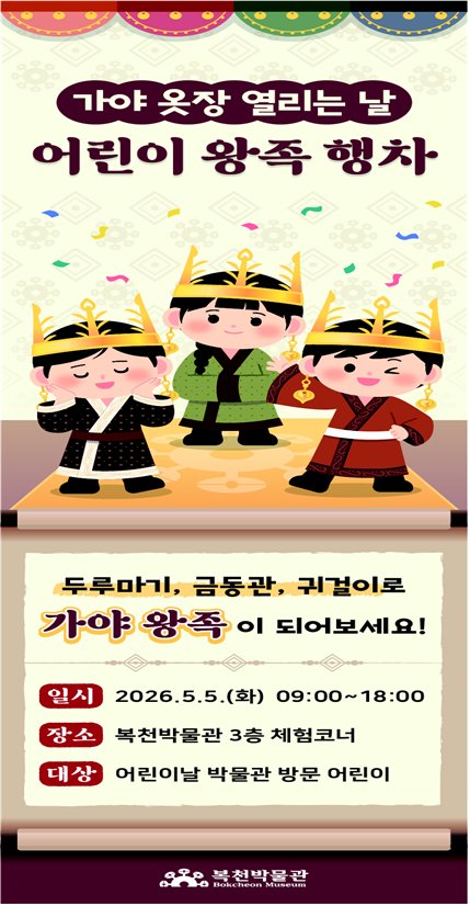 오는 5월 5일 진행되는 이번 행사는 지역 아동들이 금관가야 왕족의 화려한 옷과 장신구를 직접 체험하며 우리 고장의 역사와 문화를 친근하게 느끼도록 기획됐다.