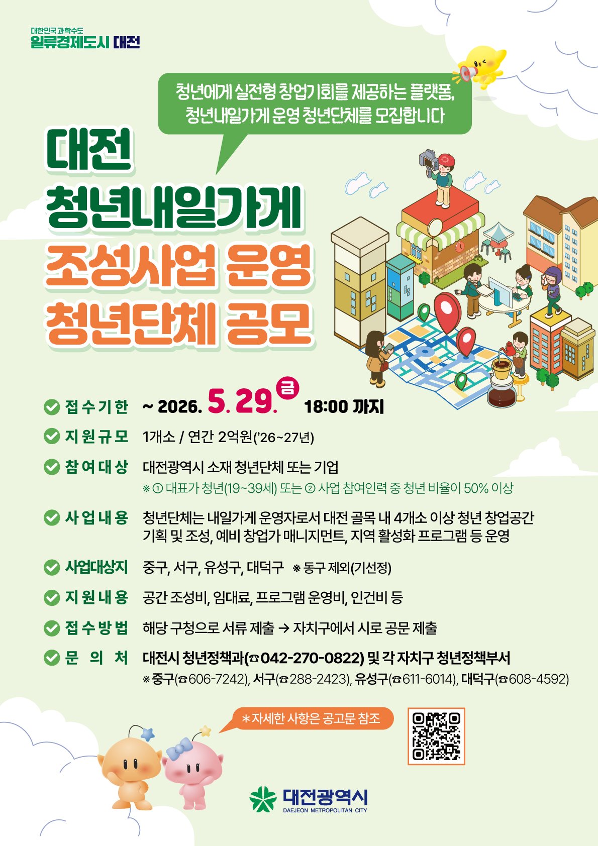 [PEDIEN] 대전시가 초기 자본 부담 없이 청년들이 창업에 도전하고 성장할 수 있는 '청년내일가게 조성사업'의 새로운 운영 단체를 공개 모집한다. 시는 오는 5월 29일까지 중구, 서구, 유성구, 대덕구 지역에서 사업을 이끌어갈 역량 있는 청년단체 또는 기업을 찾는다.