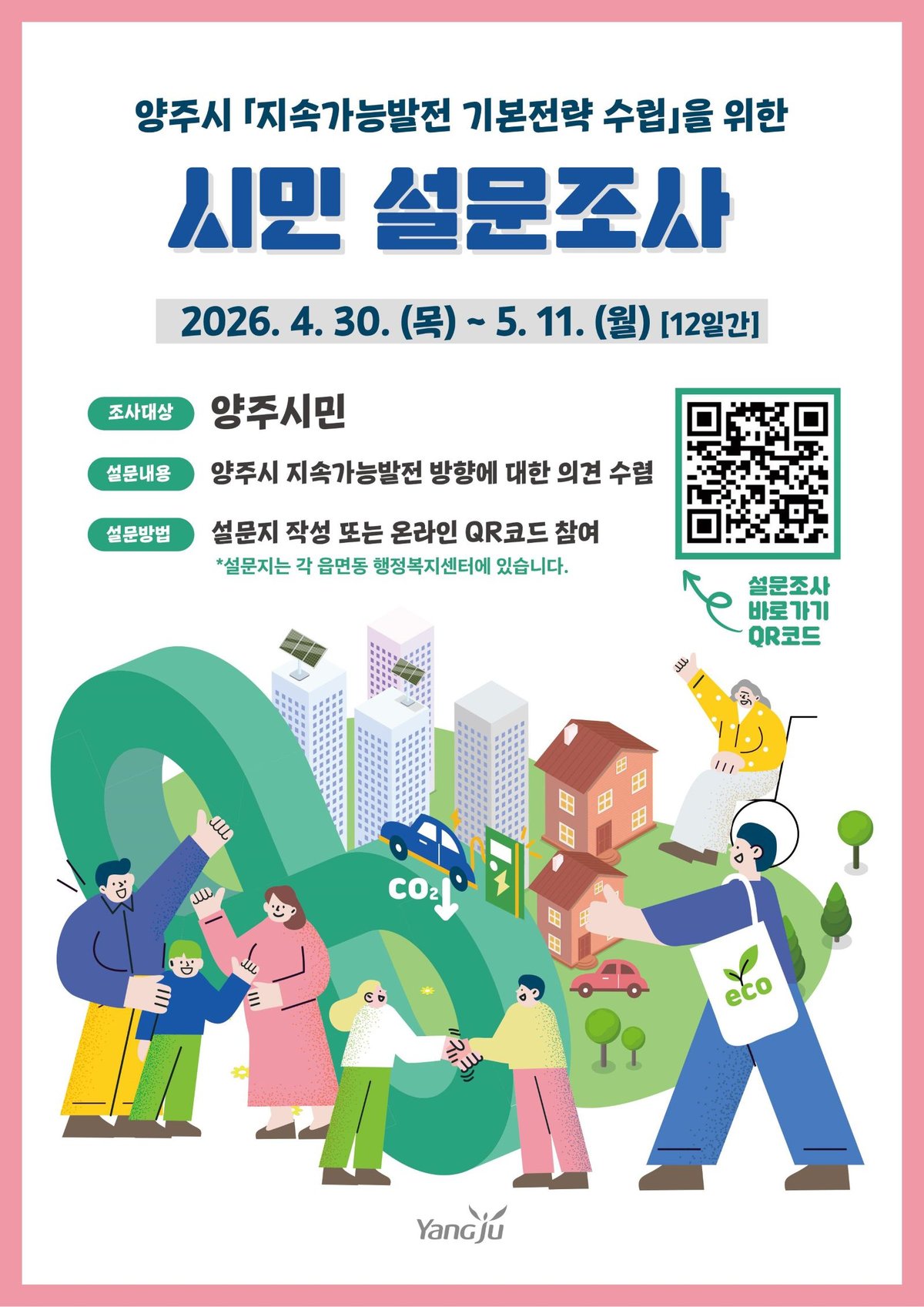 설문조사는 오는 4월 30일부터 5월 11일까지 총 12일간 진행된다. 양주시민이라면 누구나 참여할 수 있으며, QR코드를 활용한 온라인 조사와 설문지를 통한 오프라인 조사를 병행한다.