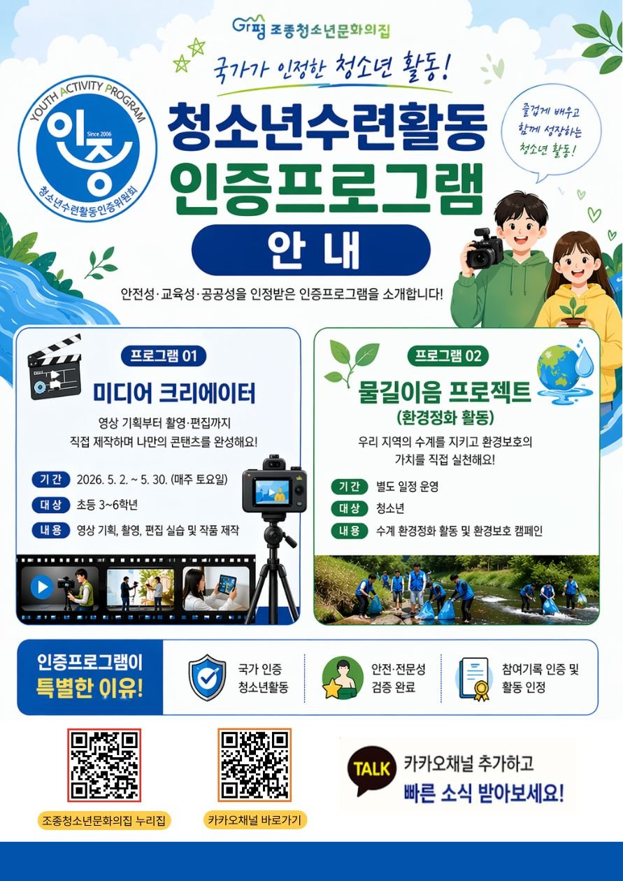 조종청소년문화의집 관계자는 “이번 국가 인증은 프로그램의 질적 수준과 공신력을 확보한 매우 중요한 계기”라고 강조했다. 이어 “앞으로도 청소년들이 주도적으로 성장할 수 있도록 다양한 프로그램을 적극적으로 개발하고 제공할 계획”이라고 덧붙였다.