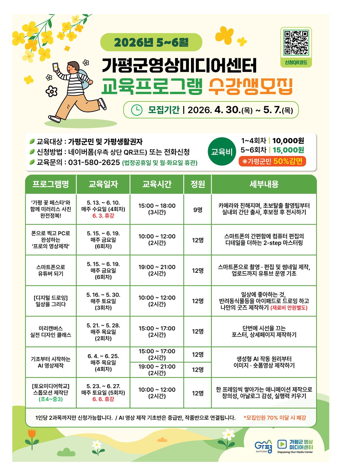 총 7개 과정으로 구성된 이번 프로그램은 ▲'가평 꽃 페스타‘와 함께 미러리스 사진 완전정복 ▲폰으로 찍고 PC 로 완성하는 프로의 영상제작 ▲스마트폰으로 유튜버 되기 ▲[디지털 드로잉] 일상을 그리다 ▲미리캔버스 실전 디자인 클래스 ▲기초부터 시작하는 AI 영상제작 ▲[토요미디어학교] 스톱모션 제작단 등이다.