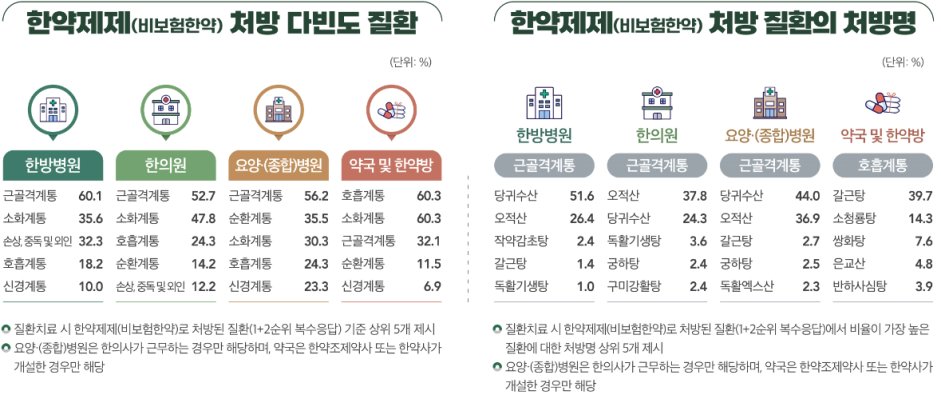 이번 조사는 2025년 9월부터 12월까지 전국 3,122개 한방의료기관과 한약 조제·판매처를 대상으로 방문 및 온라인 조사를 병행해 진행됐다. 특히 한의원과 한방병원에서 처방하는 첩약과 한약제제의 주된 용도는 단연 근골격계 질환 치료였다.