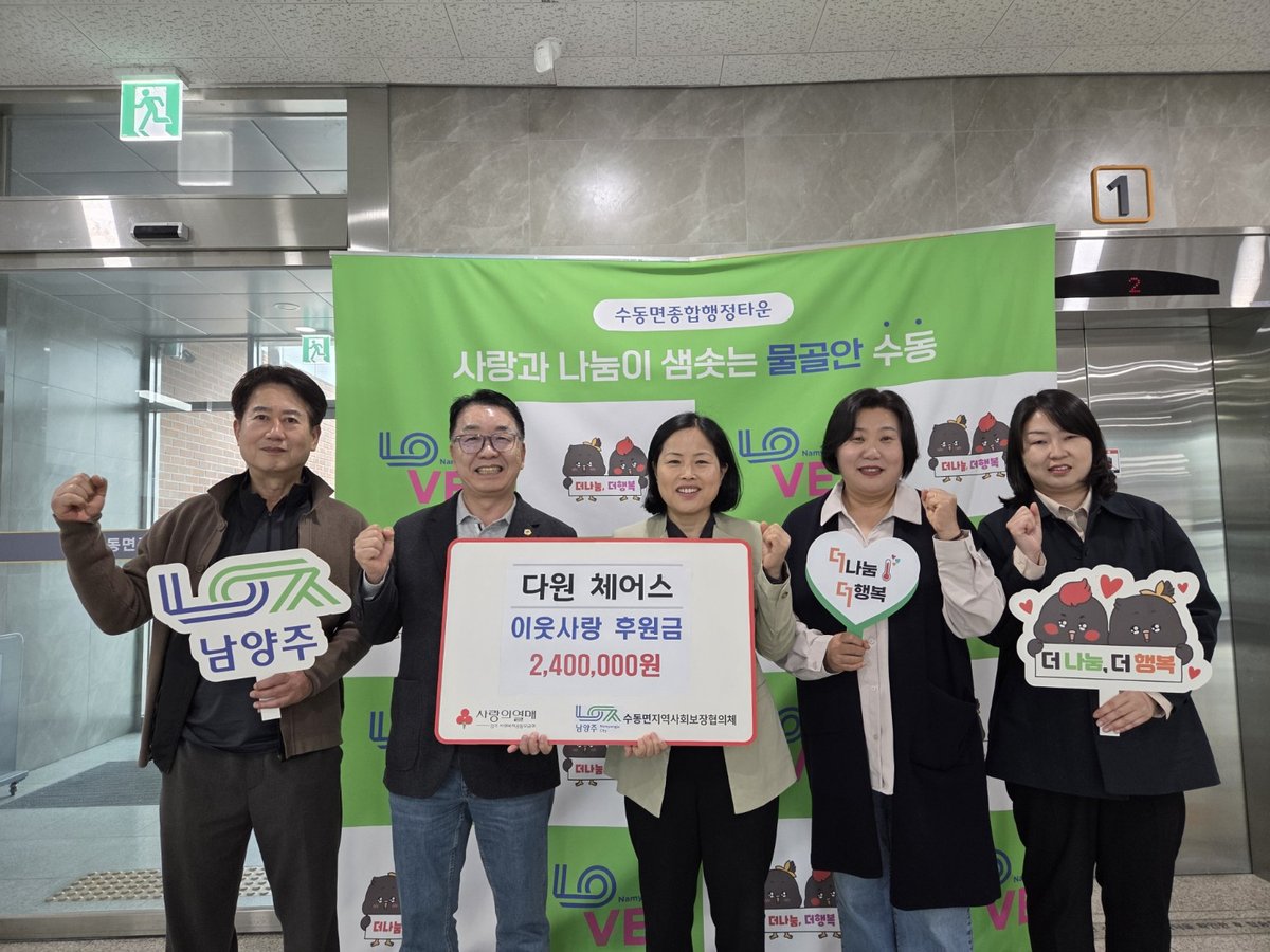 [PEDIEN] 남양주시 수동면에 위치한 다원체어스가 가정의 달을 맞아 지역 어르신들을 위한 따뜻한 나눔을 실천했다. 이 회사는 지난 28일 수동면 지역사회보장협의체에 240만원의 후원금을 전달했다.
