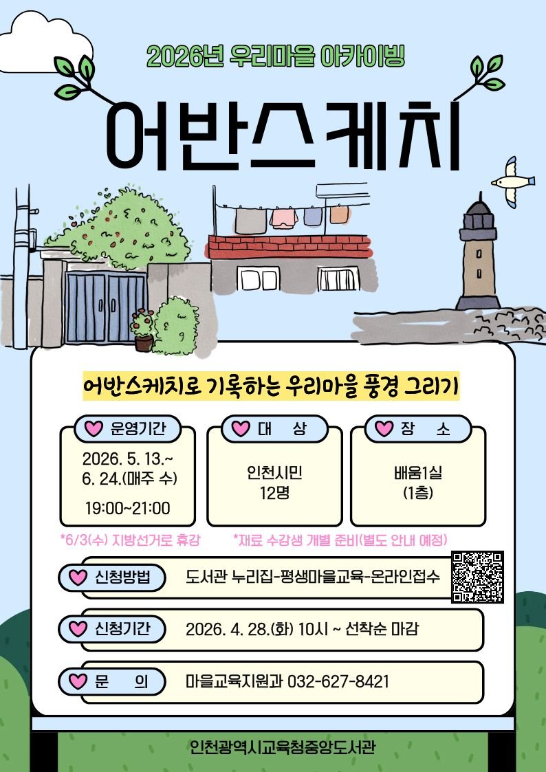 인천광역시 중앙도서관이 2026년 마을교육 아카이빙 사업의 하나로 '우리 마을 아카이빙, 어반스케치' 프로그램을 5월 13일부터 운영한다.이번 프로그램은 시민이 주체가 되어 마을 아카이브 활동에 참...