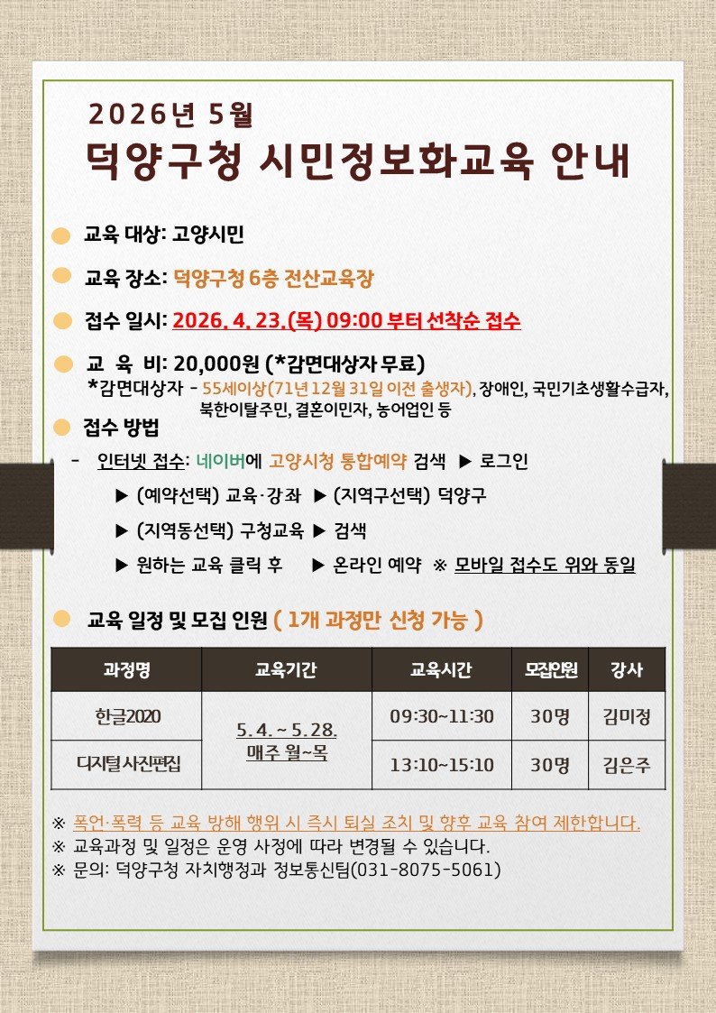고양시 덕양구, 시민 정보화 교육 수강생 23일부터 모집