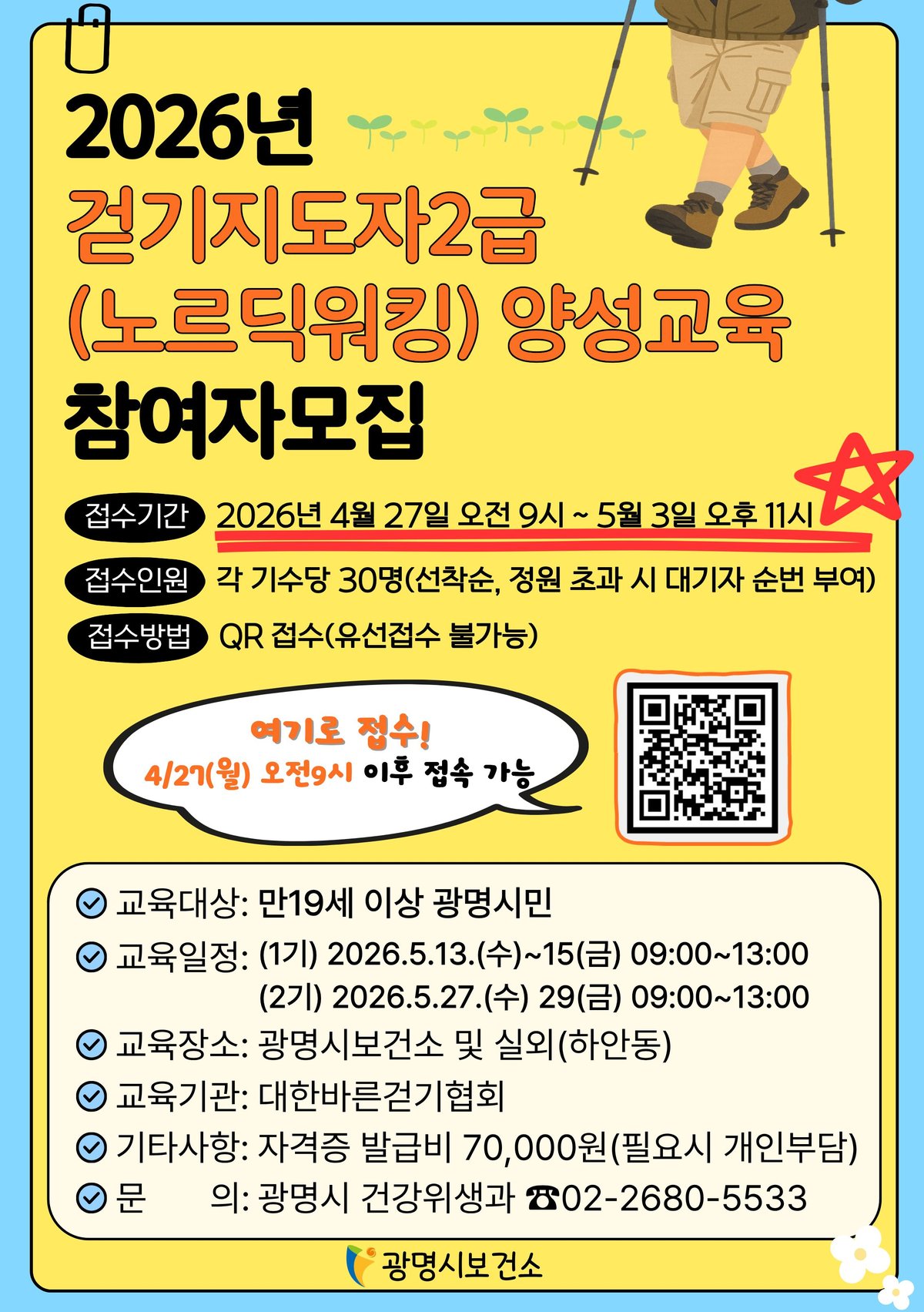 광명시가 시민들의 건강한 습관 형성과 지역사회 건강 증진을 위해 전문 걷기 지도자 양성에 본격적으로 나선다.시는 '2026년 걷기지도자 2급 양성 교육' 참여자를 오는 27일부터 선착순으로 모집한다...