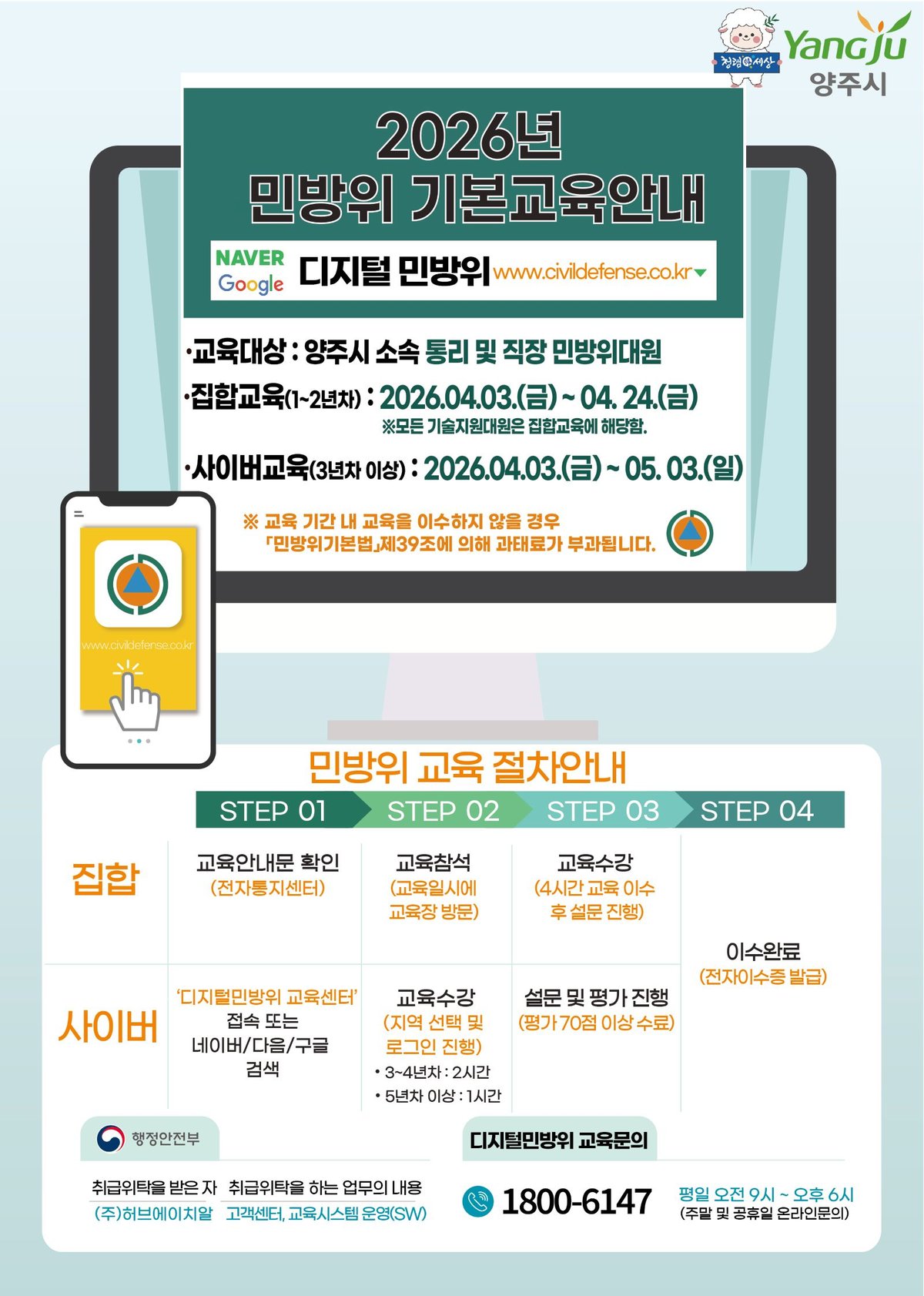 양주시가 2026년 민방위대원 기본 교육을 4월 3일부터 실시한다.이번 교육은 민방위 대원의 임무와 역할, 전시 재난 시 행동 요령 등 민방위 사태 대비 실전 역량 강화가 목표다. 1~2년차 통리 직장 민방위 대원과 모든 민방위 기술지원대원은 4월 3일부터 24일까지 집합 교육에 참여해야 한다.집합 교육은 통지서에 지정된 장소와 시간에 방문하여 QR코드 스캔 또는 신분증 확인 후 수강할 수 있다. 교육장 주차 공간이 협소하므로 대중교통 이용을 권장한다.지정된 일정에 참석이 어려울 경우 디지털민방위 카카오톡 채널에서 일정 변경이 가능하다. 알림톡을 받지 못했다면 디지털민방위 고객센터에 문의하면 된다. 타 지자체 교육 참석도 가능하며, 국민재난안전포털에서 전국 민방위 일정을 확인할 수 있다.3년차 이상 통리 직장 민방위 대원은 4월 3일부터 5월 3일까지 사이버 교육을 이수해야 한다. 사이버 교육은 디지털 민방위 홈페이지에서 수강할 수 있으며, 평가 기준을 충족하면 이수한 것으로 인정된다.기초생활보장수급자, 차상위 계층 및 그 부양의무자와 같은 자체 교육 인정 대상자는 서면 교육으로 대체 가능하다. 교재 수령 후 30일 이내에 과제물을 작성해 가까운 행정복지센터에 제출하면 된다.양주시 관계자는 민방위 교육 미이수 시 과태료가 부과될 수 있다고 강조하며, 민방위 대원들의 적극적인 참여를 당부했다. -
