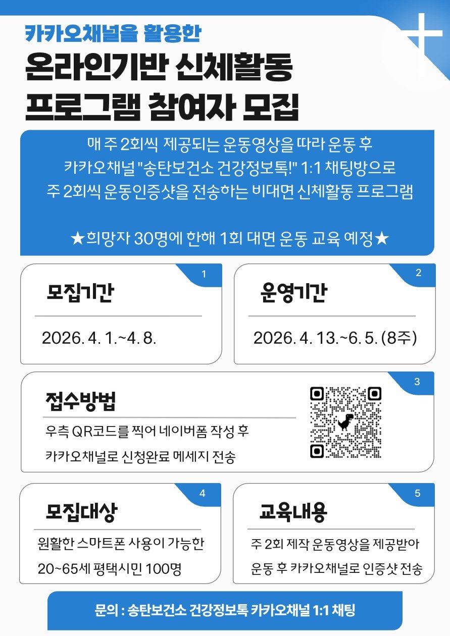 평택시가 시민들의 건강한 생활 습관 형성을 위해 팔을 걷어붙였다. 4월 13일부터 6월 5일까지 8주간 '온라인기반 신체활동 프로그램'을 운영한다고 밝혔다.이번 프로그램은 시간과 장소에 구애 없이 참여 가능하다는 장점이 있다. 보건소 방문이 어려운 시민들을 위해 '송탄보건소 카카오톡 채널'을 기반으로 운영된다.참여자들은 매주 2회 제공되는 운동 영상을 보며 운동을 하게 된다. 이후 인증 사진을 제출하면 운동전문가의 맞춤형 평가를 받을 수 있다. 꾸준한 운동 실천에 도움이 될 것으로 기대된다.특히 프로그램 참여자 중 희망자를 대상으로 특별한 혜택이 주어진다. 보건소에서 강사와 함께하는 '원데이 클래스'가 운영될 예정이다. 비대면과 대면 방식을 결합해 운동 효과를 극대화한다는 계획이다.참가자 모집은 이미 시작됐다. 4월 1일부터 8일까지 20세부터 65세 사이의 평택시민 100명을 모집한다. 스마트폰 활용이 가능한 시민이라면 누구나 신청할 수 있다.신청 방법은 간단하다. 카카오톡 채널 '송탄보건소 건강정보톡'을 추가한 후 네이버 폼을 통해 신청서를 제출하면 된다.송탄보건소 관계자는 앞으로도 시민 건강 증진을 위한 노력을 아끼지 않겠다고 강조했다. "만성질환 예방을 위한 다양한 프로그램을 지속적으로 추진하겠다"고 말했다. -