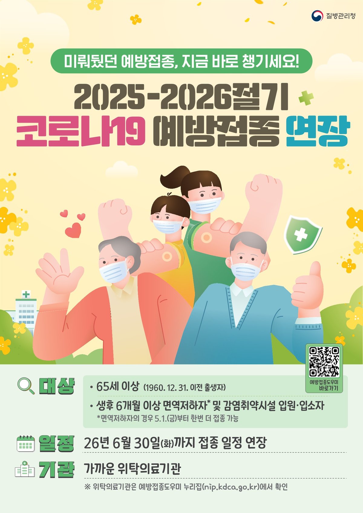 이천시가 코로나19 고위험군 대상 예방접종 기간을 6월 30일까지 연장한다.이는 질병관리청 지침에 따른 것으로, 다가오는 여름철 코로나19 재유행에 선제적으로 대비하기 위함이다.접종 대상은 2025-2026절기 코...