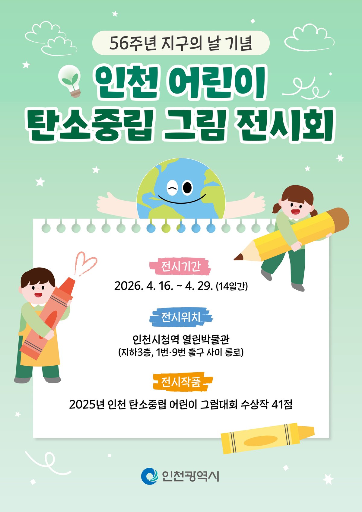 인천시립박물관이 인천지하철 1호선 인천시청역 내 '열린박물관'에서 어린이 탄소중립 그림 전시회를 개최한다. 제56회 지구의 날을 기념하며, 전시 기간은 4월 16일부터 30일까지다.이번 전시회는 인...