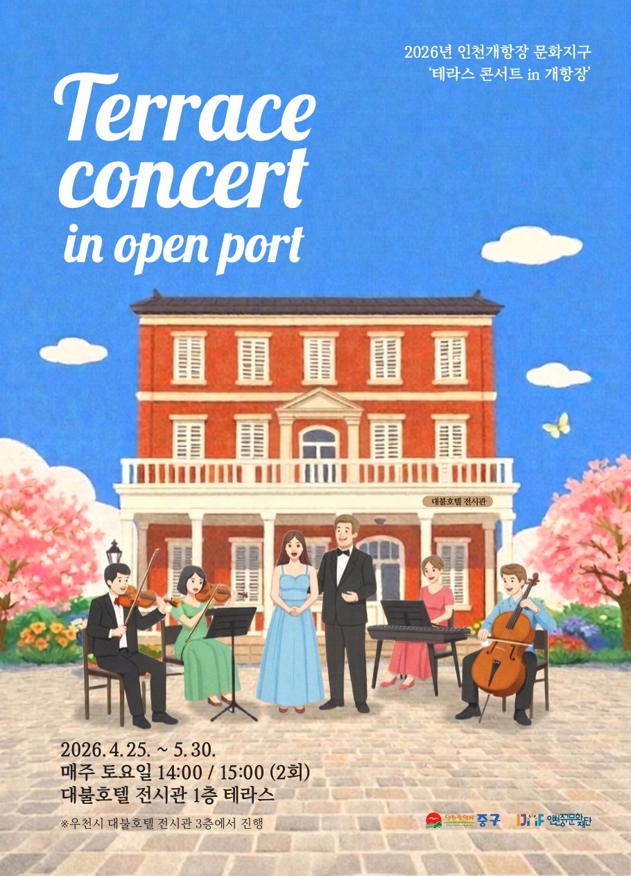 인천 중구의 개항장 문화지구가 오는 4월 25일부터 6주 동안 특별한 음악으로 물든다.인천중구문화재단은 '테라스 콘서트 in 개항장'을 개최한다고 밝혔다. 이번 공연은 매주 토요일, 대불호텔 전시관 ...
