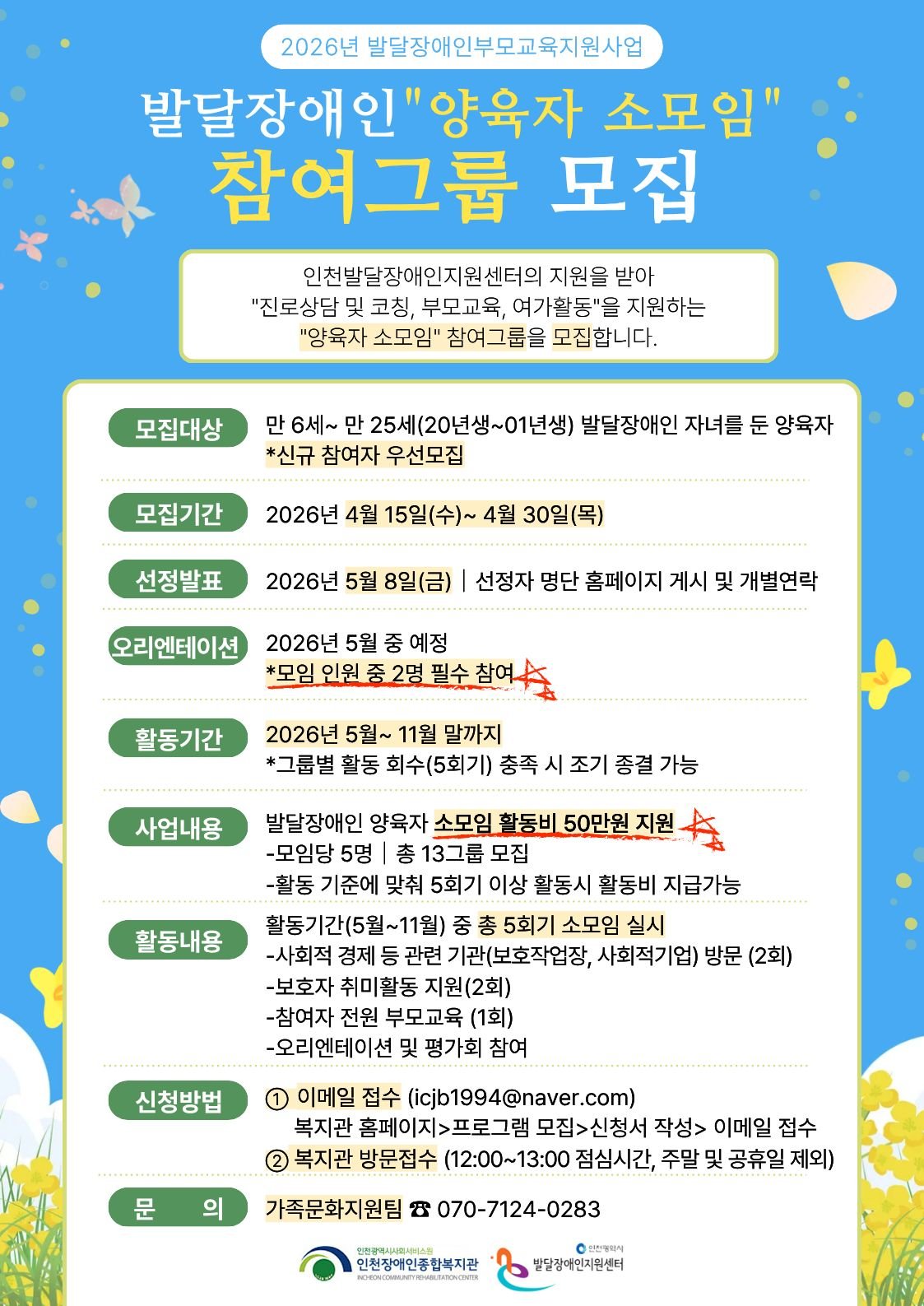 인천장애인종합복지관이 발달장애인 양육자를 위한 소모임 참여자를 모집한다.만 6세부터 25세 사이의 발달장애인 자녀를 둔 양육자라면 누구나 신청 가능하다. 총 13개 그룹을 선발하며, 새로운 참여자를 우선적...