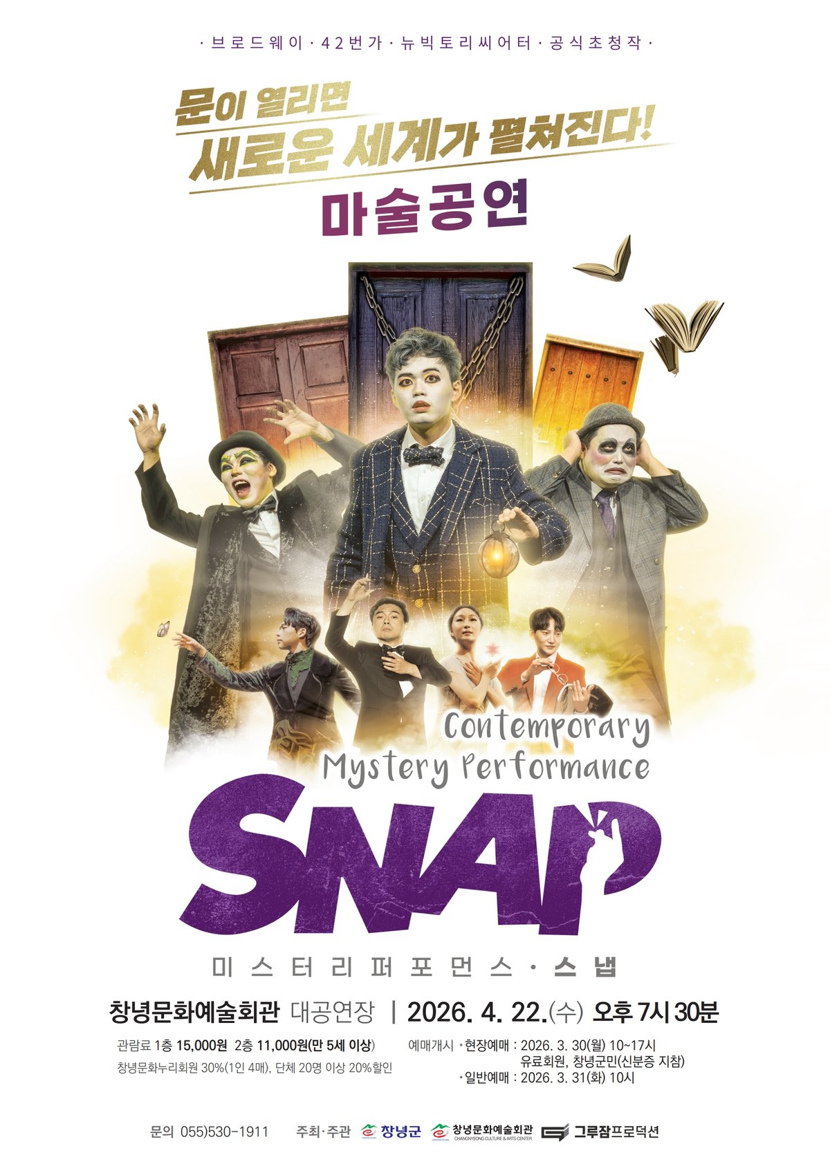 창녕군이 4월 22일 오후 7시 30분 창녕문화예술회관 대공연장에서 특별한 마술쇼 '스냅'을 선보인다.이번 공연은 단순한 마술을 넘어선 복합 예술 퍼포먼스다. 마임, 섀도 그래피, 미디어아트, 신체극 등이 유기적으로 결합되어 다채로운 볼거리를 제공한다.특히 '스냅'은 해외에서 이미 정평이 난 작품이다. 영국 에든버러 프린지 페스티벌에서 '아시안 아츠 어워드 대상'을 수상했고, 브로드웨이와 뉴욕 빅토리 극장에도 초청받은 바 있다. 전 세계 평단과 관객으로부터 극찬을 받았다.공연 내용은 독특한 능력을 지닌 캐릭터들이 시간의 문을 통해 여행을 떠나는 이야기다. 대사가 없는 넌버벌 형식이어서 언어 장벽 없이 누구나 쉽게 몰입할 수 있다는 장점이 있다. 고도의 마술 기술과 수준 높은 연출이 어우러져 잊지 못할 경험을 선사할 것으로 기대된다.창녕군 관계자는 이번 기획공연에 대해 다음과 같이 밝혔다. "군민들에게 일상의 활력을 불어넣고, 수준 높은 문화 향유 기회를 제공하고자 마련했다."이어 "세계가 인정한 창의적인 무대를 창녕에서 직접 만나보시길 바란다"고 덧붙였다. '스냅' 공연은 창녕군민에게 특별한 문화 체험 기회를 제공할 전망이다. -