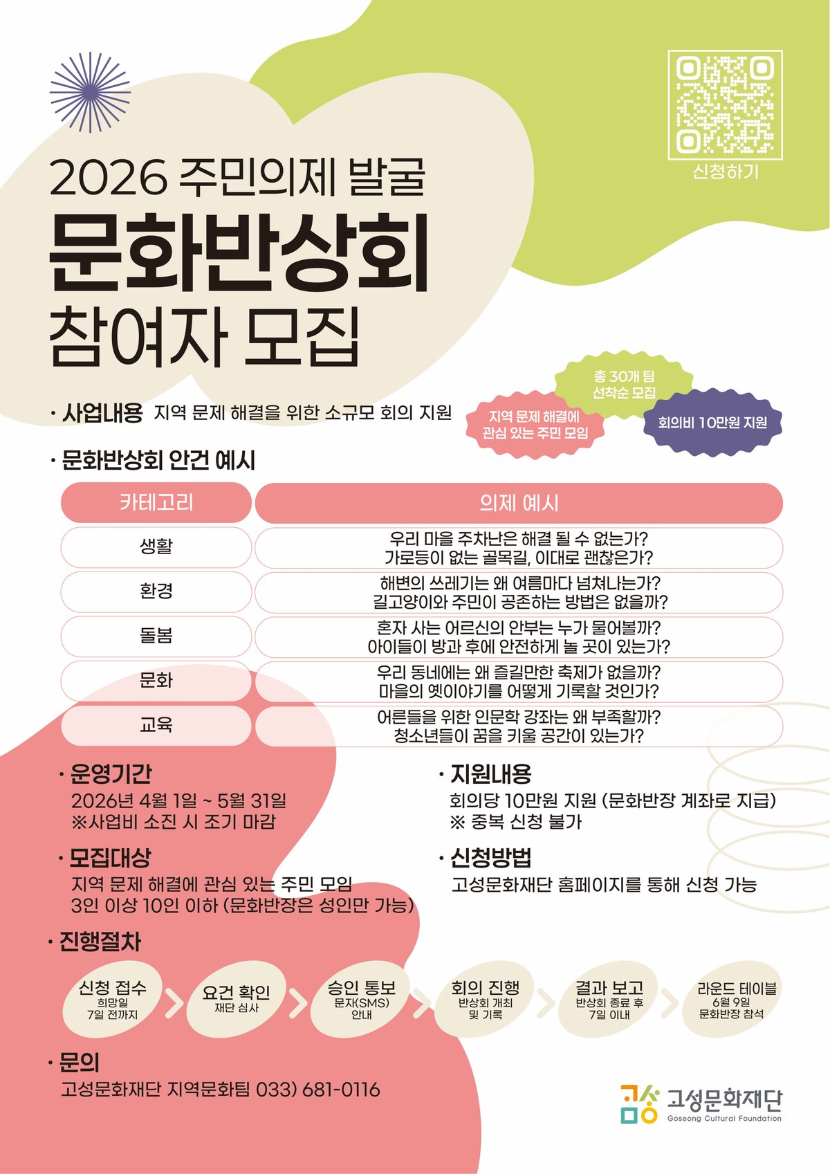 고성군이 주민 스스로 지역 문제를 진단하고 해결책을 모색하는 '문화반상회' 참여 모임을 4월 1일부터 5월 31일까지 모집한다.고성문화재단이 주관하는 이번 사업은 주민들의 작은 아이디어가 지역 사회 변화로 이어지도록 지원하는 데 목적이 있다.‘문화반상회’는 단순한 모임이 아닌, 일상 속 불편함을 토론하고 실질적인 변화를 만들어내는 공론의 장이다.고성군에 거주하며 지역 문제에 관심 있는 3인 이상 주민 모임은 누구나 신청할 수 있다.올해는 특히 '질문형 의제' 방식을 도입해 참여자들이 더욱 구체적인 문제 해결 방안을 모색하도록 유도한다.참여자들은 생활, 환경, 돌봄, 문화, 교육 등 5가지 분야 중 하나를 선택하여 자유롭게 의견을 나눌 수 있다. 예를 들어 '우리 마을 주차난은 해결될 수 없는가?' 또는 '길고양이와 공존할 방법은 무엇일까?' 와 같은 질문을 던지며 대화의 물꼬를 트게 된다.총 30개 팀을 선착순으로 선정하며, 선정된 모임에는 회의 운영비 10만원이 지원된다.각 반상회는 모임 후 7일 이내에 결과보고서와 현장 사진을 재단 홈페이지에 올려야 한다.6월 9일에는 각 팀 대표들이 모여 '문화반장 라운드테이블'을 개최한다.여기서 전문 퍼실리테이터와 함께 30개의 의제를 정리, 고성군의 '핵심 의제 5건'을 도출한다.도출된 의제는 군청 관련 부서에 정책 제안서 형태로 전달될 예정이다.고성문화재단 관계자는 “이웃과 나누는 소소한 고민들이 지역사회를 바꾸는 유의미한 데이터와 정책으로 연계되길 바란다”고 말했다.이어 “일상의 고민을 나누고 해결책을 함께 찾아갈 군민 여러분의 많은 참여를 바란다”고 덧붙였다.접수는 모임 희망일 최소 7일 전까지 고성문화재단 홈페이지를 통해 온라인으로 신청하면 된다.예산 소진 시 조기 마감될 수 있다.자세한 사항은 고성문화재단 홈페이지 또는 지역문화팀에 문의하면 된다. -