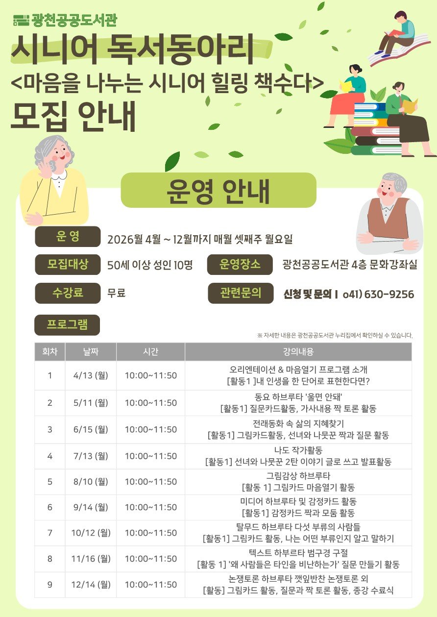 광천공공도서관, 시니어 독서 동아리 '마음을 나누는 힐링 책수다' 운영