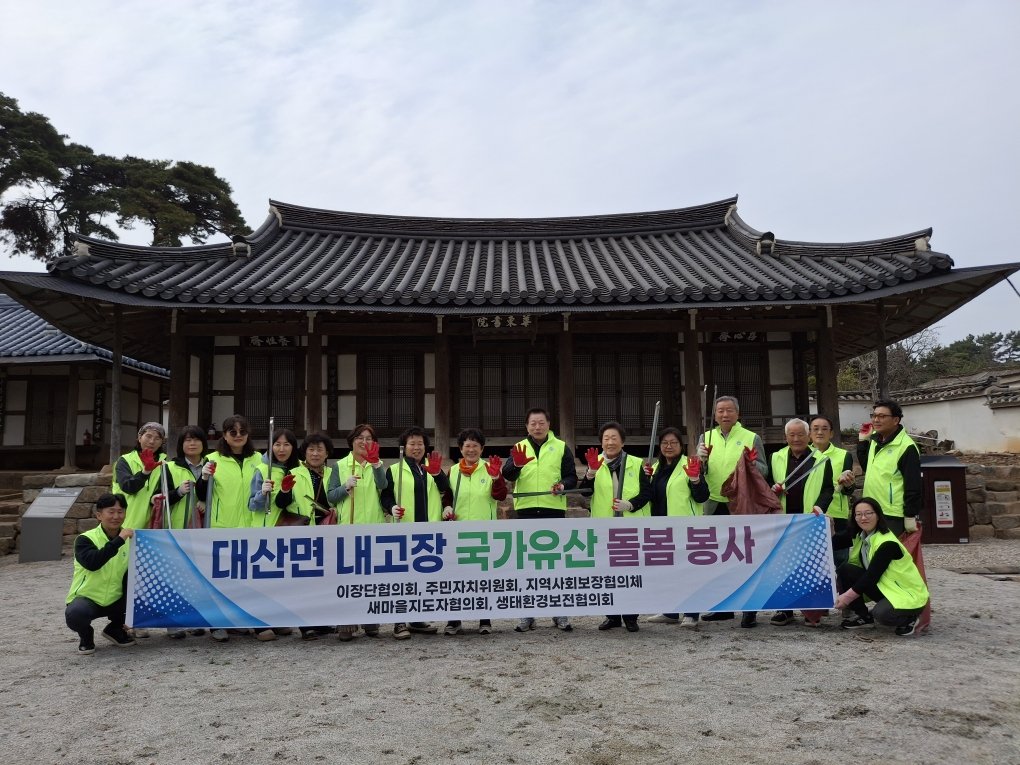 고창군 대산면 지역사회보장협의체가 '내 고장 국가유산돌봄 봉사'를 통해 지역 복지 증진에 나섰다.지난 31일, 대산면 지사협은 정기회의를 열고 지역사회 공헌 활동의 일환으로 국가유산 돌봄 봉사를 추진했다. 위원들은 화동서원 일대에서 환경 정화 활동을 펼치며 구슬땀을 흘렸다.이번 정기회의에서는 2026년 특화사업 추진 방향에 대한 심도 깊은 논의가 이루어졌다. '행복한 반찬마실 지원사업'과 '빨래터 운영' 등 주요 특화사업에 대한 다양한 의견이 오갔다.특히, 이번 봉사활동은 화동서원 주변 환경을 정비하고 지역 자산을 체계적으로 관리하기 위해 마련됐다. 협의체 위원들은 적극적으로 참여하여 깨끗하고 쾌적한 환경을 조성하는 데 힘을 보탰다.김영민 민간위원장은 “위원들이 함께 힘을 모아 지역을 직접 가꾸는 활동에 참여하게 되어 뜻깊게 생각한다”고 소감을 밝혔다. 이어 “앞으로도 위원들과 함께 꾸준한 활동을 이어가겠다”고 덧붙였다.정현영 대산면장은 “이번 활동은 지역복지와 환경을 함께 살피는 의미 있는 시간이었다”고 평가했다. 정 면장은 “앞으로도 주민이 체감할 수 있는 생활환경 개선과 복지 향상을 위해 지속적으로 노력하겠다”고 강조했다.대산면 지사협은 앞으로도 지역 주민들을 위한 다양한 봉사활동과 특화사업을 추진하며 따뜻한 지역 사회를 만들어나갈 계획이다. 국가유산 돌봄 봉사를 통해 지역사회에 대한 관심과 애정을 높이는 데 기여할 것으로 기대된다. -