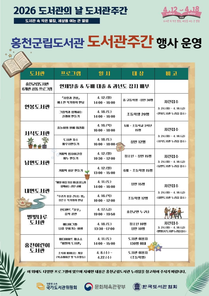 홍천군립도서관이 2026년 '도서관의 날'과 도서관 주간을 기념해 4월 한 달간 군민들을 위한 다채로운 독서 문화 프로그램을 운영한다.도서관 속 작은 펼침, 세상을 여는 큰 열림 이라는 주제로 진행되는 올해 도서관 주간은 책 한 권을 펼치는 손끝의 호기심이 미래의 지식과 기술로 확장되는 가치를 조명한다.홍천군립도서관은 6개 관에서 각각 특색 있는 프로그램을 선보일 예정이다. 작가와의 만남, 만들기 체험, 문화 공연, 원화 전시 등 풍성한 볼거리를 제공한다.특히 행사 기간 동안 도서관 이용자에게는 도서 대출 시 특별한 혜택을 제공하는 독서 이벤트도 마련된다. 도서관 방문을 장려하고 독서에 대한 관심을 높이기 위한 취지다.프로그램 일정과 참여 방법은 홍천군립도서관 누리집에서 확인하거나, 각 도서관에 직접 문의하면 자세한 안내를 받을 수 있다.이성희 교육체육과 과장은 “이번 도서관 주간을 통해 지역 주민들이 도서관에서 새로운 즐거움을 경험하길 바란다”고 말했다. 덧붙여 “앞으로도 도서관이 지역사회의 열린 공간 역할을 수행할 수 있도록 노력하겠다”고 밝혔다. -