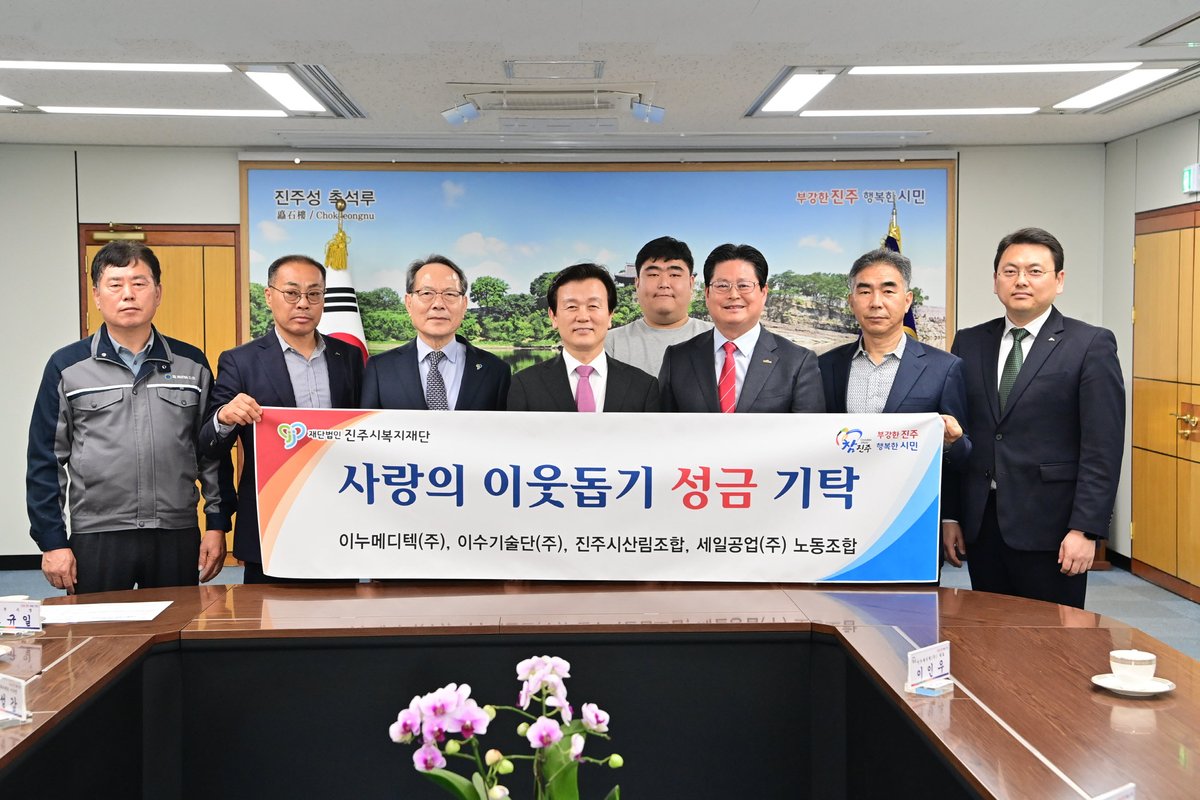 진주시복지재단에 지역 기업과 단체의 따뜻한 온정이 이어지고 있다. 어려운 이웃을 돕기 위한 성금 기탁식이 6일 진주시청에서 열렸다.이날 기탁식에는 이누메디텍, 이수기술단, 진주시산림조합, 세일공업 노동...