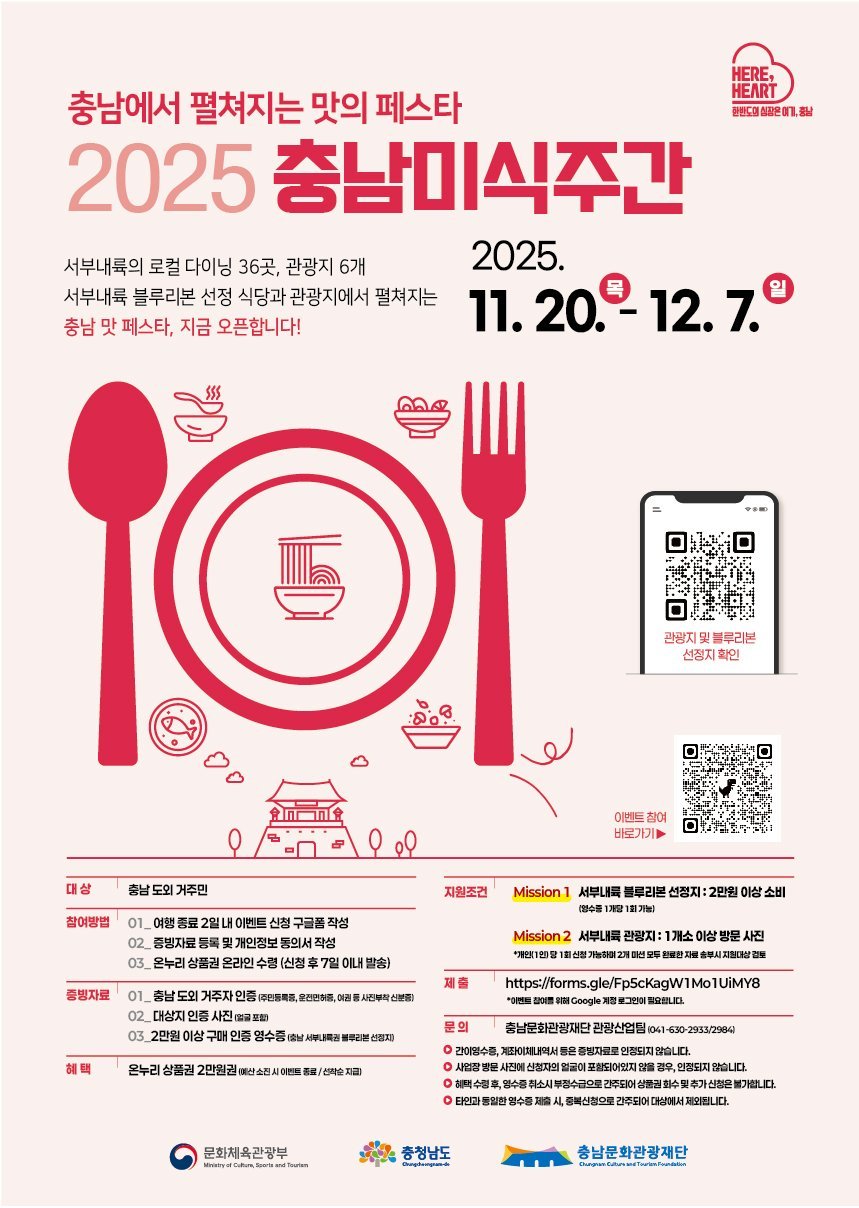 충남도가 지역 관광 활성화를 위해 '충남 미식 주간'을 선포하고, 외지인 대상 맛집 탐방 이벤트를 진행한다.이번 행사는 11월 20일부터 12월 7일까지 진행되며, '충남에서 펼쳐지는 맛의 페스타&...