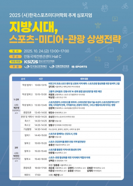 한국스포츠미디어학회는 10월 24일 오후 1시부터 안동국제컨벤션센터에서 ‘2025 추계 심포지엄’을 개최한다. 이번 심포지엄은 ‘스포츠와 미디어를 통한 지역 활성화 및 균형발전 전략’을 주제로 지방 소멸 위기 ...